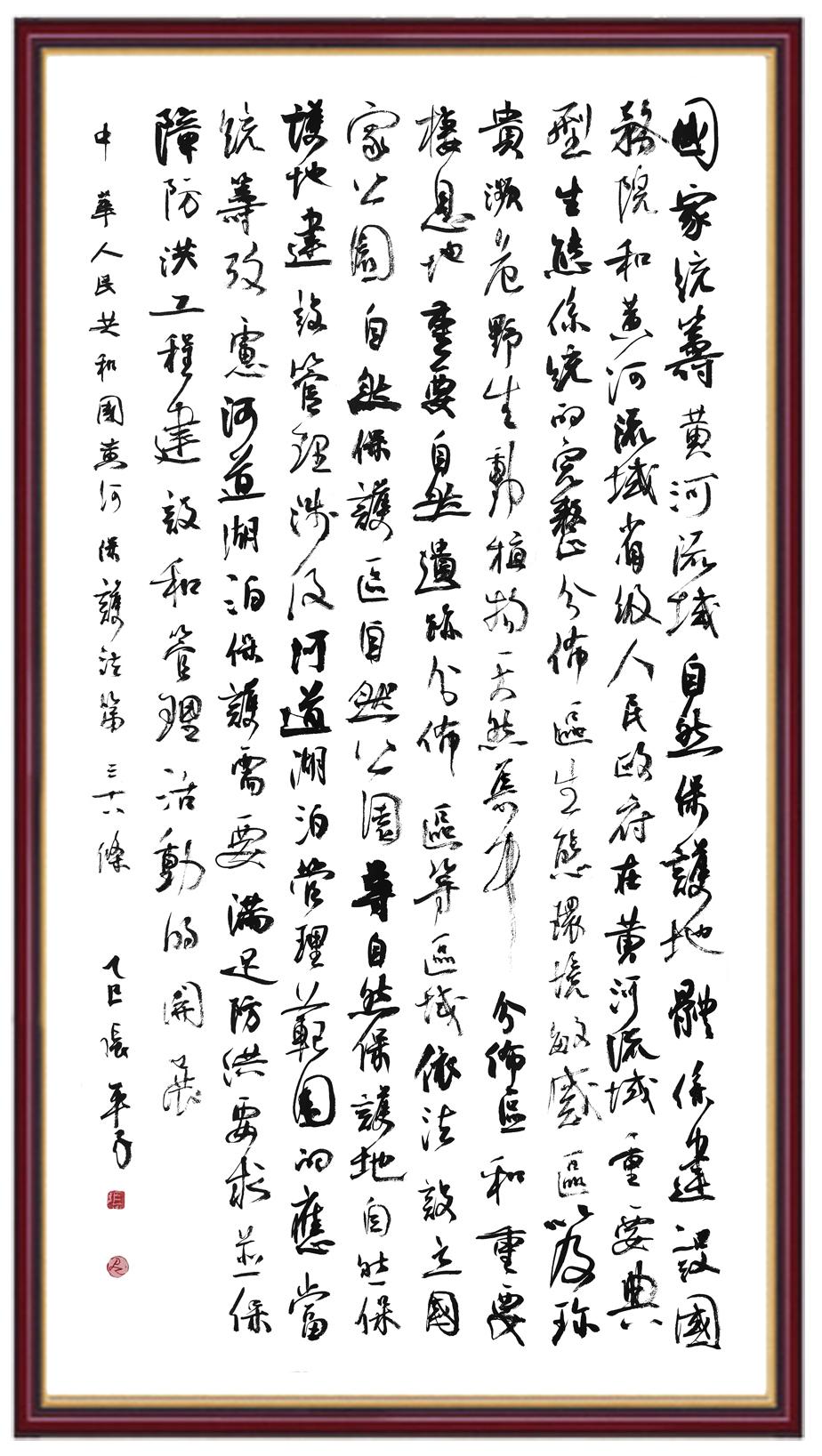 黃河寧,天下平。黃河是中華民族的發(fā)源地和搖籃,保護黃河是事關(guān)中華民族偉大復(fù)興的千秋大計?!吨腥A人民共和國黃河保護法》為推進水資源節(jié)約集約利用、保護傳承弘揚黃河文化、推動黃河流域生態(tài)保護和高質(zhì)量發(fā)展提供了有力法治保障。繼書寫《中華人民共和國民法典》《中華人民共和國憲法》《中華人民共和國澳門特別行政區(qū)基本法》《中華人民共和國香港特別行政區(qū)基本法》《中華人民共和國國旗法》《中華人民共和國國徽法》《中華人民共和國國歌法》《中華人民共和國法官法》等法律法規(guī)之后,法制日報社聯(lián)合沿黃九?。▍^(qū))司法廳、書法家協(xié)會,將筆端對準《中華人民共和國黃河保護法》。