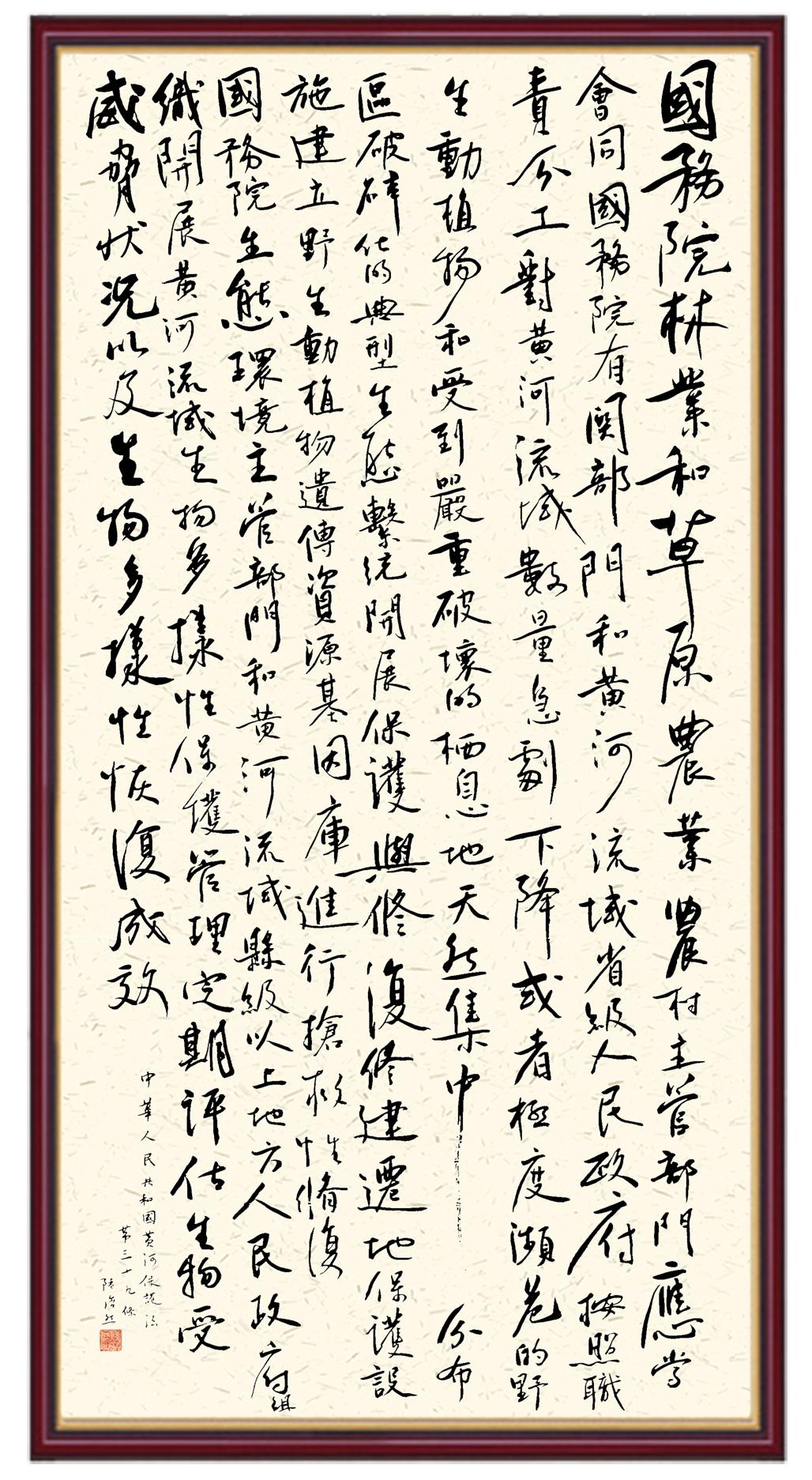 黃河寧,天下平。黃河是中華民族的發(fā)源地和搖籃,保護(hù)黃河是事關(guān)中華民族偉大復(fù)興的千秋大計(jì)?!吨腥A人民共和國(guó)黃河保護(hù)法》為推進(jìn)水資源節(jié)約集約利用、保護(hù)傳承弘揚(yáng)黃河文化、推動(dòng)黃河流域生態(tài)保護(hù)和高質(zhì)量發(fā)展提供了有力法治保障。繼書寫《中華人民共和國(guó)民法典》《中華人民共和國(guó)憲法》《中華人民共和國(guó)澳門特別行政區(qū)基本法》《中華人民共和國(guó)香港特別行政區(qū)基本法》《中華人民共和國(guó)國(guó)旗法》《中華人民共和國(guó)國(guó)徽法》《中華人民共和國(guó)國(guó)歌法》《中華人民共和國(guó)法官法》等法律法規(guī)之后,法制日?qǐng)?bào)社聯(lián)合沿黃九省(區(qū))司法廳、書法家協(xié)會(huì),將筆端對(duì)準(zhǔn)《中華人民共和國(guó)黃河保護(hù)法》。