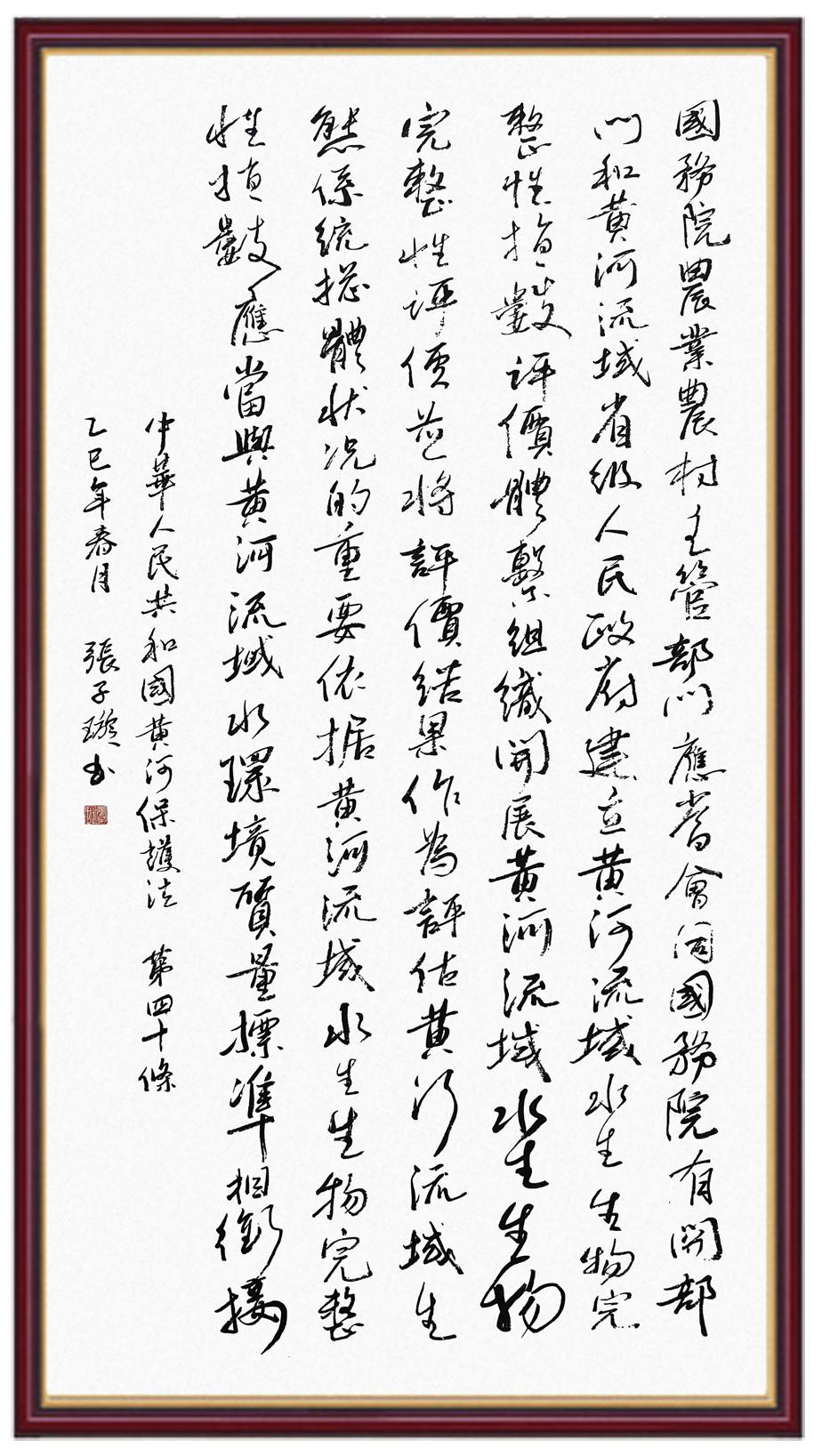 黃河寧,天下平。黃河是中華民族的發(fā)源地和搖籃,保護(hù)黃河是事關(guān)中華民族偉大復(fù)興的千秋大計(jì)。《中華人民共和國(guó)黃河保護(hù)法》為推進(jìn)水資源節(jié)約集約利用、保護(hù)傳承弘揚(yáng)黃河文化、推動(dòng)黃河流域生態(tài)保護(hù)和高質(zhì)量發(fā)展提供了有力法治保障。繼書(shū)寫(xiě)《中華人民共和國(guó)民法典》《中華人民共和國(guó)憲法》《中華人民共和國(guó)澳門(mén)特別行政區(qū)基本法》《中華人民共和國(guó)香港特別行政區(qū)基本法》《中華人民共和國(guó)國(guó)旗法》《中華人民共和國(guó)國(guó)徽法》《中華人民共和國(guó)國(guó)歌法》《中華人民共和國(guó)法官法》等法律法規(guī)之后,法制日?qǐng)?bào)社聯(lián)合沿黃九?。▍^(qū))司法廳、書(shū)法家協(xié)會(huì),將筆端對(duì)準(zhǔn)《中華人民共和國(guó)黃河保護(hù)法》。