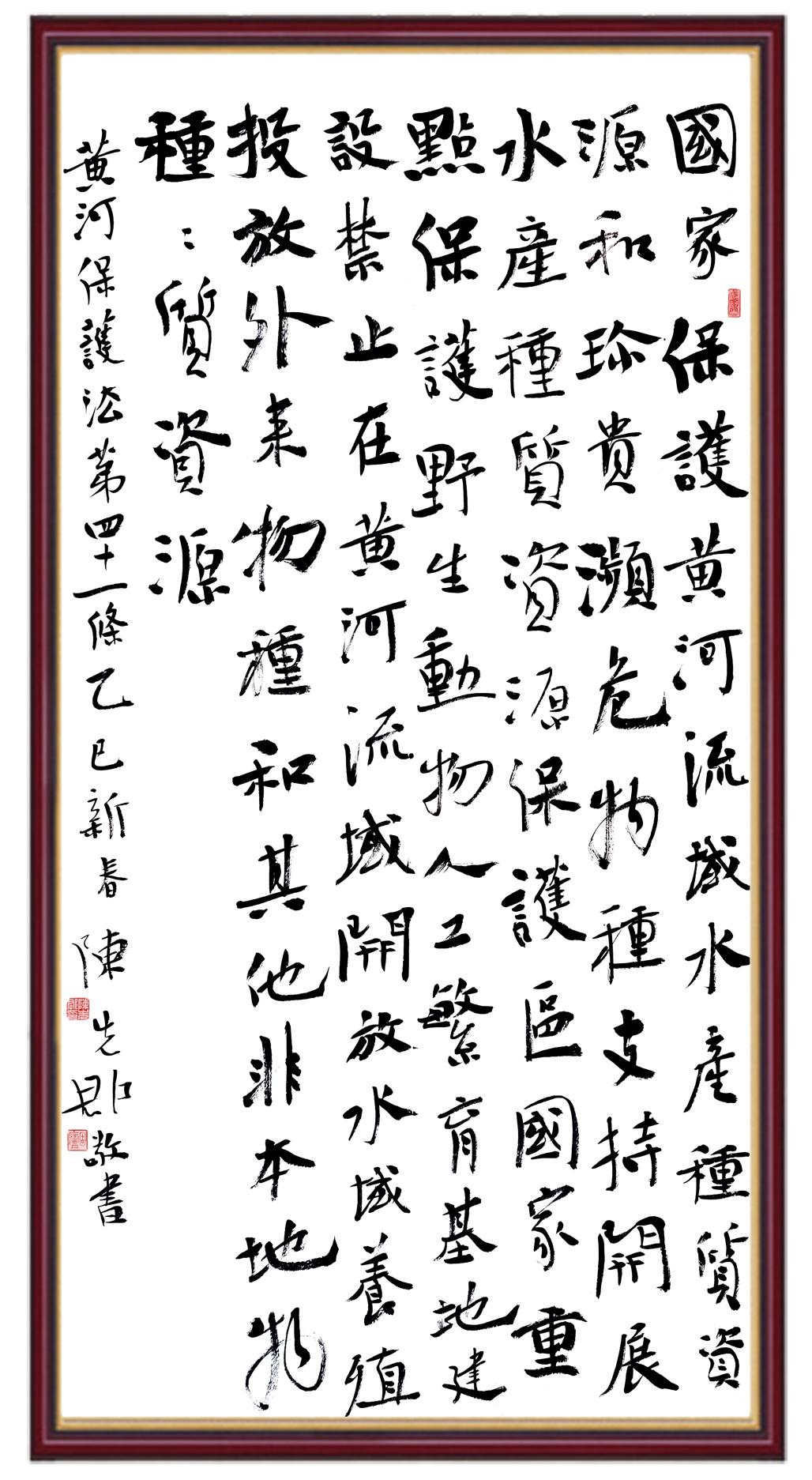 黃河寧,天下平。黃河是中華民族的發(fā)源地和搖籃,保護(hù)黃河是事關(guān)中華民族偉大復(fù)興的千秋大計(jì)?!吨腥A人民共和國黃河保護(hù)法》為推進(jìn)水資源節(jié)約集約利用、保護(hù)傳承弘揚(yáng)黃河文化、推動(dòng)黃河流域生態(tài)保護(hù)和高質(zhì)量發(fā)展提供了有力法治保障。繼書寫《中華人民共和國民法典》《中華人民共和國憲法》《中華人民共和國澳門特別行政區(qū)基本法》《中華人民共和國香港特別行政區(qū)基本法》《中華人民共和國國旗法》《中華人民共和國國徽法》《中華人民共和國國歌法》《中華人民共和國法官法》等法律法規(guī)之后,法制日?qǐng)?bào)社聯(lián)合沿黃九?。▍^(qū))司法廳、書法家協(xié)會(huì),將筆端對(duì)準(zhǔn)《中華人民共和國黃河保護(hù)法》。