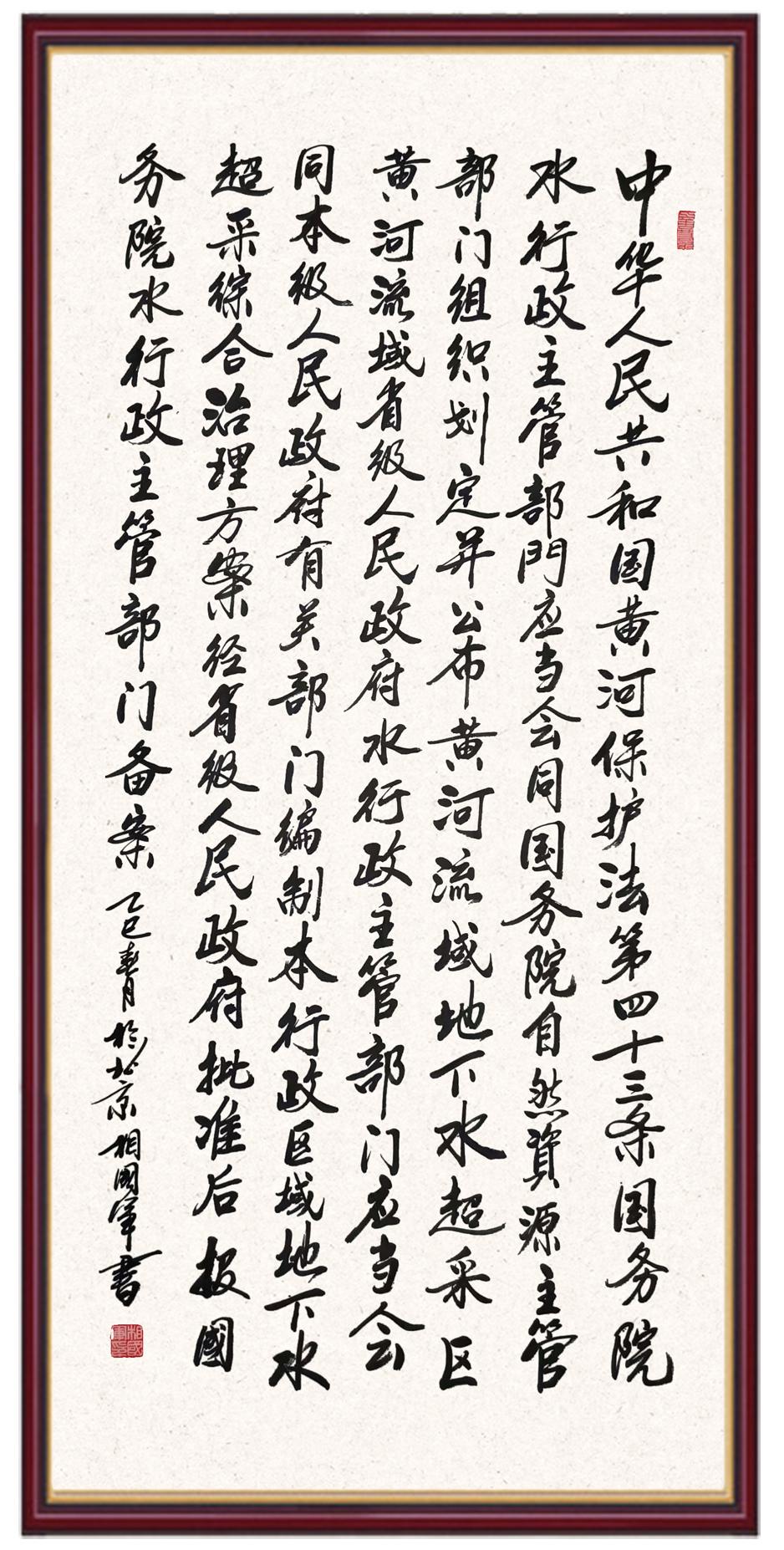 黃河寧,天下平。黃河是中華民族的發(fā)源地和搖籃,保護(hù)黃河是事關(guān)中華民族偉大復(fù)興的千秋大計(jì)?!吨腥A人民共和國黃河保護(hù)法》為推進(jìn)水資源節(jié)約集約利用、保護(hù)傳承弘揚(yáng)黃河文化、推動(dòng)黃河流域生態(tài)保護(hù)和高質(zhì)量發(fā)展提供了有力法治保障。繼書寫《中華人民共和國民法典》《中華人民共和國憲法》《中華人民共和國澳門特別行政區(qū)基本法》《中華人民共和國香港特別行政區(qū)基本法》《中華人民共和國國旗法》《中華人民共和國國徽法》《中華人民共和國國歌法》《中華人民共和國法官法》等法律法規(guī)之后,法制日報(bào)社聯(lián)合沿黃九?。▍^(qū))司法廳、書法家協(xié)會(huì),將筆端對準(zhǔn)《中華人民共和國黃河保護(hù)法》。