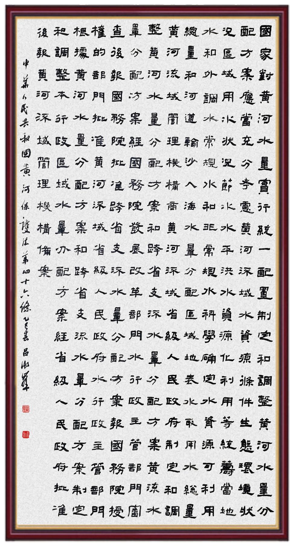 黃河寧,天下平。黃河是中華民族的發(fā)源地和搖籃,保護黃河是事關(guān)中華民族偉大復(fù)興的千秋大計?!吨腥A人民共和國黃河保護法》為推進水資源節(jié)約集約利用、保護傳承弘揚黃河文化、推動黃河流域生態(tài)保護和高質(zhì)量發(fā)展提供了有力法治保障。繼書寫《中華人民共和國民法典》《中華人民共和國憲法》《中華人民共和國澳門特別行政區(qū)基本法》《中華人民共和國香港特別行政區(qū)基本法》《中華人民共和國國旗法》《中華人民共和國國徽法》《中華人民共和國國歌法》《中華人民共和國法官法》等法律法規(guī)之后,法制日報社聯(lián)合沿黃九省(區(qū))司法廳、書法家協(xié)會,將筆端對準《中華人民共和國黃河保護法》。
