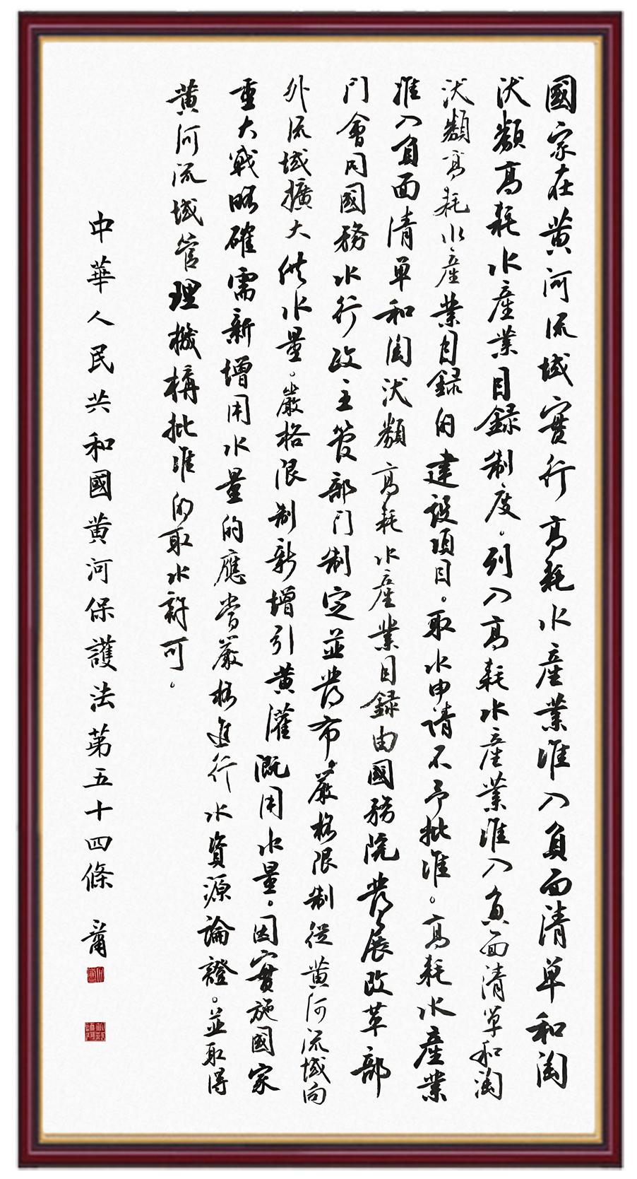 黃河寧,天下平。黃河是中華民族的發(fā)源地和搖籃,保護(hù)黃河是事關(guān)中華民族偉大復(fù)興的千秋大計(jì)?!吨腥A人民共和國黃河保護(hù)法》為推進(jìn)水資源節(jié)約集約利用、保護(hù)傳承弘揚(yáng)黃河文化、推動(dòng)黃河流域生態(tài)保護(hù)和高質(zhì)量發(fā)展提供了有力法治保障。繼書寫《中華人民共和國民法典》《中華人民共和國憲法》《中華人民共和國澳門特別行政區(qū)基本法》《中華人民共和國香港特別行政區(qū)基本法》《中華人民共和國國旗法》《中華人民共和國國徽法》《中華人民共和國國歌法》《中華人民共和國法官法》等法律法規(guī)之后,法制日?qǐng)?bào)社聯(lián)合沿黃九?。▍^(qū))司法廳、書法家協(xié)會(huì),將筆端對(duì)準(zhǔn)《中華人民共和國黃河保護(hù)法》。