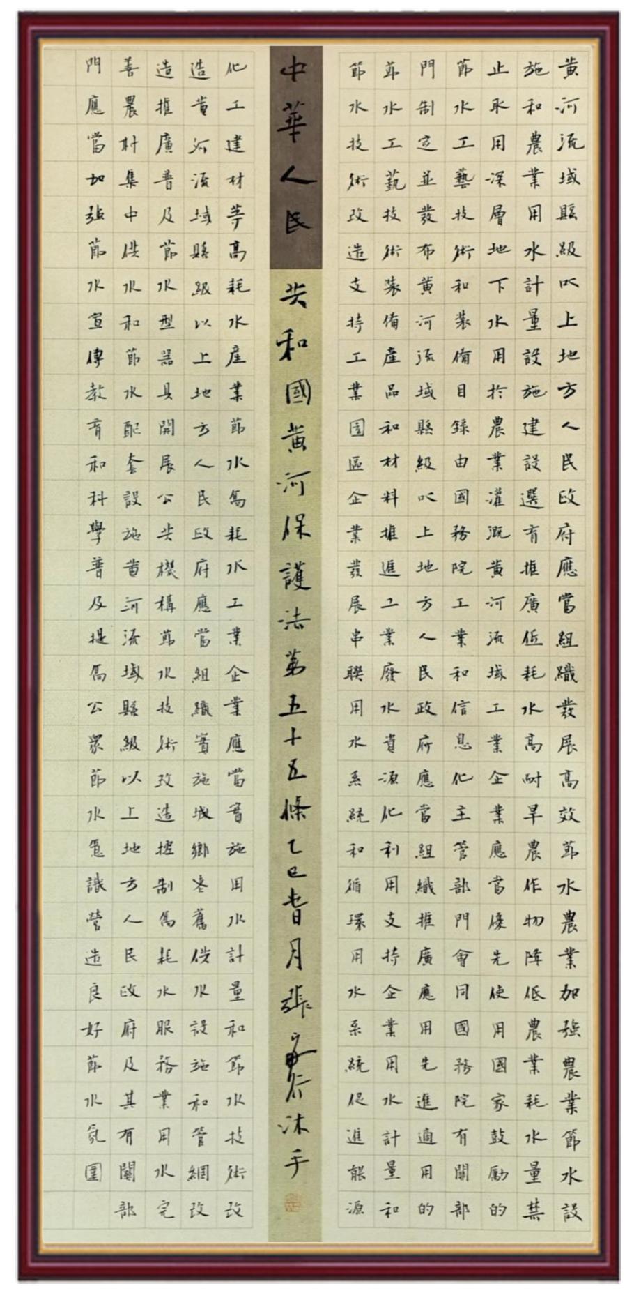 黃河寧,天下平。黃河是中華民族的發(fā)源地和搖籃,保護黃河是事關(guān)中華民族偉大復(fù)興的千秋大計?!吨腥A人民共和國黃河保護法》為推進水資源節(jié)約集約利用、保護傳承弘揚黃河文化、推動黃河流域生態(tài)保護和高質(zhì)量發(fā)展提供了有力法治保障。繼書寫《中華人民共和國民法典》《中華人民共和國憲法》《中華人民共和國澳門特別行政區(qū)基本法》《中華人民共和國香港特別行政區(qū)基本法》《中華人民共和國國旗法》《中華人民共和國國徽法》《中華人民共和國國歌法》《中華人民共和國法官法》等法律法規(guī)之后,法制日報社聯(lián)合沿黃九?。▍^(qū))司法廳、書法家協(xié)會,將筆端對準《中華人民共和國黃河保護法》。