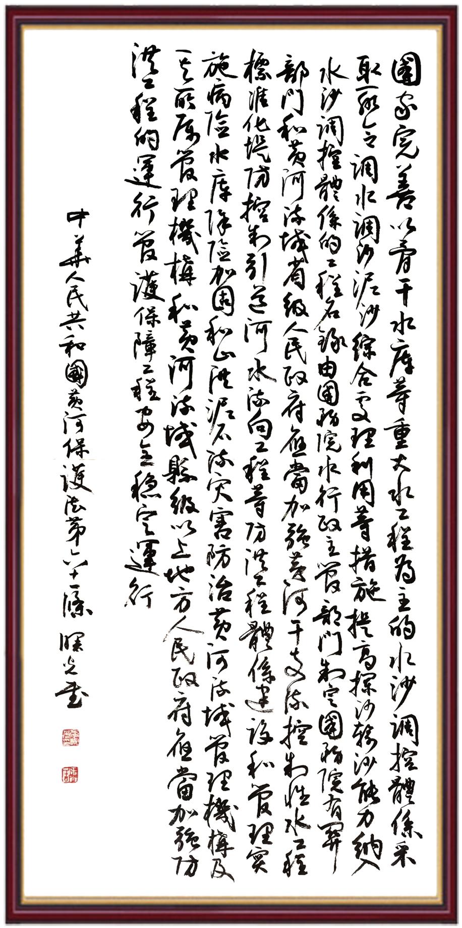 黃河寧,天下平。黃河是中華民族的發(fā)源地和搖籃,保護黃河是事關(guān)中華民族偉大復(fù)興的千秋大計?!吨腥A人民共和國黃河保護法》為推進水資源節(jié)約集約利用、保護傳承弘揚黃河文化、推動黃河流域生態(tài)保護和高質(zhì)量發(fā)展提供了有力法治保障。繼書寫《中華人民共和國民法典》《中華人民共和國憲法》《中華人民共和國澳門特別行政區(qū)基本法》《中華人民共和國香港特別行政區(qū)基本法》《中華人民共和國國旗法》《中華人民共和國國徽法》《中華人民共和國國歌法》《中華人民共和國法官法》等法律法規(guī)之后,法制日報社聯(lián)合沿黃九?。▍^(qū))司法廳、書法家協(xié)會,將筆端對準(zhǔn)《中華人民共和國黃河保護法》。
