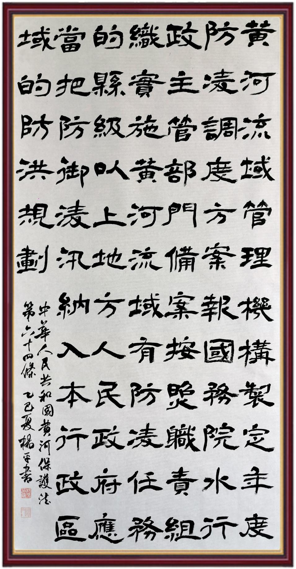 黃河寧,天下平。黃河是中華民族的發(fā)源地和搖籃,保護(hù)黃河是事關(guān)中華民族偉大復(fù)興的千秋大計?!吨腥A人民共和國黃河保護(hù)法》為推進(jìn)水資源節(jié)約集約利用、保護(hù)傳承弘揚(yáng)黃河文化、推動黃河流域生態(tài)保護(hù)和高質(zhì)量發(fā)展提供了有力法治保障。繼書寫《中華人民共和國民法典》《中華人民共和國憲法》《中華人民共和國澳門特別行政區(qū)基本法》《中華人民共和國香港特別行政區(qū)基本法》《中華人民共和國國旗法》《中華人民共和國國徽法》《中華人民共和國國歌法》《中華人民共和國法官法》等法律法規(guī)之后,法制日報社聯(lián)合沿黃九省(區(qū))司法廳、書法家協(xié)會,將筆端對準(zhǔn)《中華人民共和國黃河保護(hù)法》。