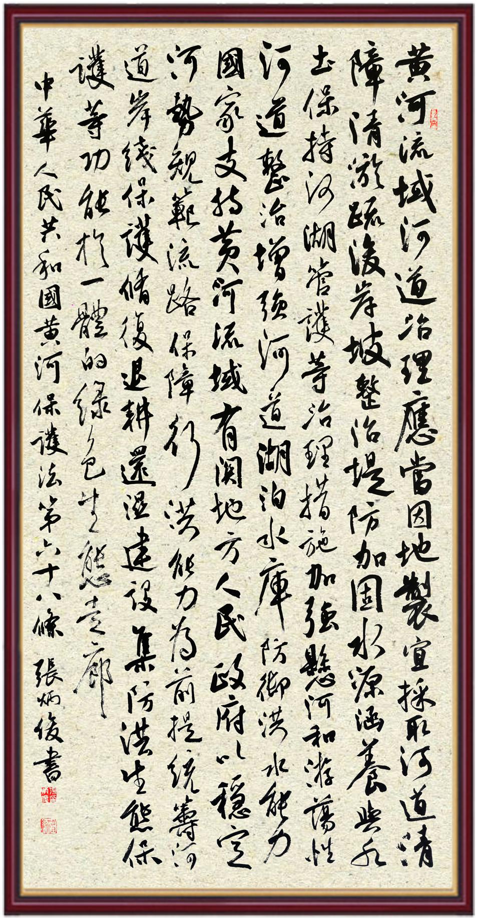 黃河寧,天下平。黃河是中華民族的發(fā)源地和搖籃,保護黃河是事關(guān)中華民族偉大復(fù)興的千秋大計?!吨腥A人民共和國黃河保護法》為推進水資源節(jié)約集約利用、保護傳承弘揚黃河文化、推動黃河流域生態(tài)保護和高質(zhì)量發(fā)展提供了有力法治保障。繼書寫《中華人民共和國民法典》《中華人民共和國憲法》《中華人民共和國澳門特別行政區(qū)基本法》《中華人民共和國香港特別行政區(qū)基本法》《中華人民共和國國旗法》《中華人民共和國國徽法》《中華人民共和國國歌法》《中華人民共和國法官法》等法律法規(guī)之后,法制日報社聯(lián)合沿黃九?。▍^(qū))司法廳、書法家協(xié)會,將筆端對準(zhǔn)《中華人民共和國黃河保護法》。
