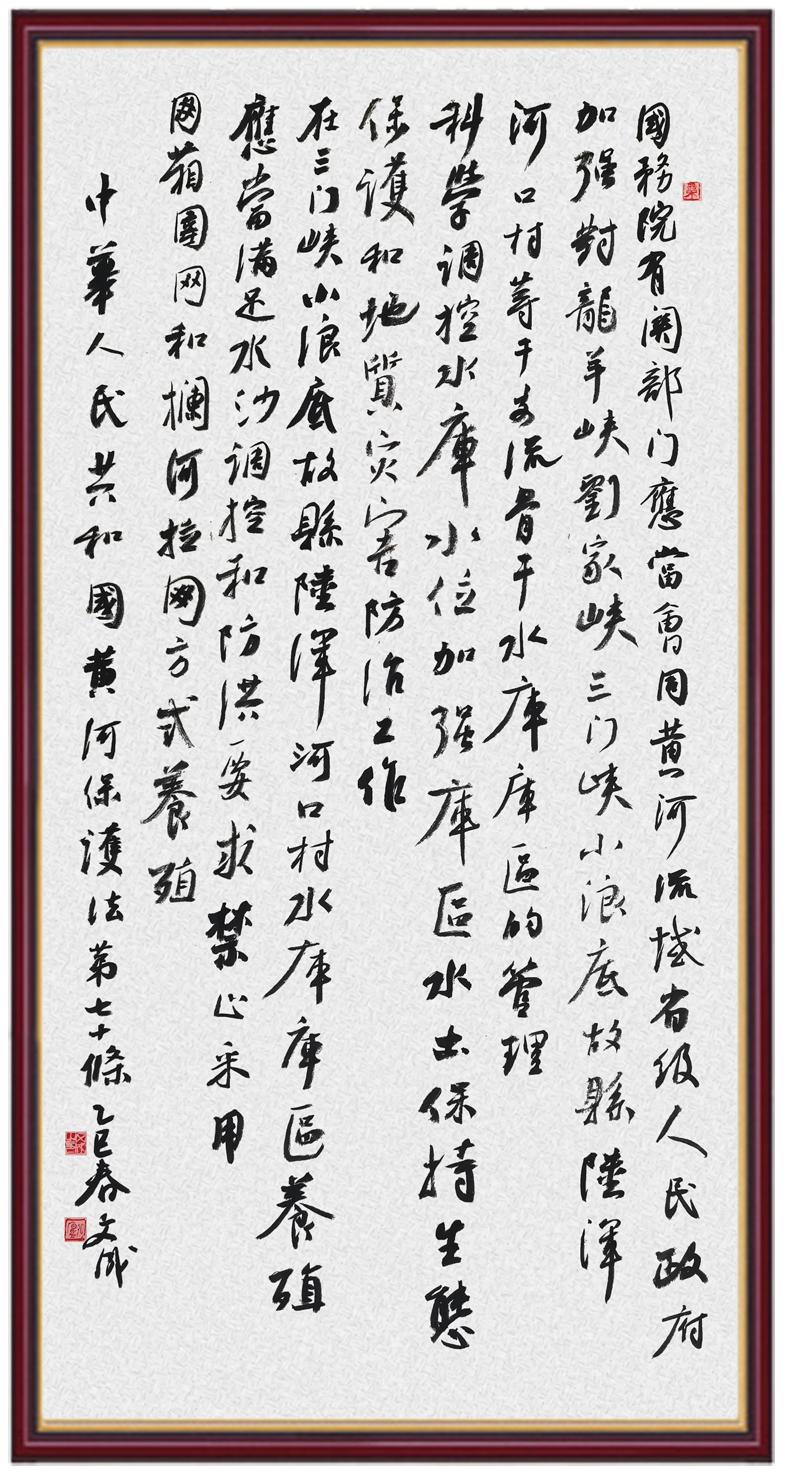 黃河寧,天下平。黃河是中華民族的發(fā)源地和搖籃,保護(hù)黃河是事關(guān)中華民族偉大復(fù)興的千秋大計(jì)。《中華人民共和國(guó)黃河保護(hù)法》為推進(jìn)水資源節(jié)約集約利用、保護(hù)傳承弘揚(yáng)黃河文化、推動(dòng)黃河流域生態(tài)保護(hù)和高質(zhì)量發(fā)展提供了有力法治保障。繼書寫《中華人民共和國(guó)民法典》《中華人民共和國(guó)憲法》《中華人民共和國(guó)澳門特別行政區(qū)基本法》《中華人民共和國(guó)香港特別行政區(qū)基本法》《中華人民共和國(guó)國(guó)旗法》《中華人民共和國(guó)國(guó)徽法》《中華人民共和國(guó)國(guó)歌法》《中華人民共和國(guó)法官法》等法律法規(guī)之后,法制日?qǐng)?bào)社聯(lián)合沿黃九省(區(qū))司法廳、書法家協(xié)會(huì),將筆端對(duì)準(zhǔn)《中華人民共和國(guó)黃河保護(hù)法》。