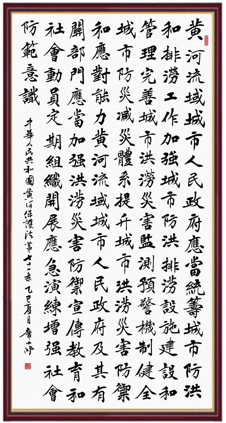 黃河寧,天下平。黃河是中華民族的發(fā)源地和搖籃,保護(hù)黃河是事關(guān)中華民族偉大復(fù)興的千秋大計(jì)?!吨腥A人民共和國(guó)黃河保護(hù)法》為推進(jìn)水資源節(jié)約集約利用、保護(hù)傳承弘揚(yáng)黃河文化、推動(dòng)黃河流域生態(tài)保護(hù)和高質(zhì)量發(fā)展提供了有力法治保障。繼書(shū)寫(xiě)《中華人民共和國(guó)民法典》《中華人民共和國(guó)憲法》《中華人民共和國(guó)澳門(mén)特別行政區(qū)基本法》《中華人民共和國(guó)香港特別行政區(qū)基本法》《中華人民共和國(guó)國(guó)旗法》《中華人民共和國(guó)國(guó)徽法》《中華人民共和國(guó)國(guó)歌法》《中華人民共和國(guó)法官法》等法律法規(guī)之后,法制日?qǐng)?bào)社聯(lián)合沿黃九省(區(qū))司法廳、書(shū)法家協(xié)會(huì),將筆端對(duì)準(zhǔn)《中華人民共和國(guó)黃河保護(hù)法》。