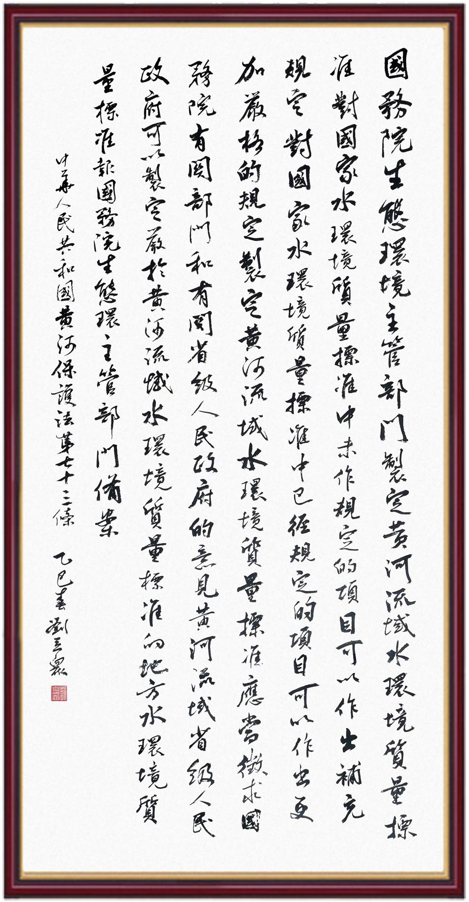 黃河寧,天下平。黃河是中華民族的發(fā)源地和搖籃,保護黃河是事關(guān)中華民族偉大復興的千秋大計?!吨腥A人民共和國黃河保護法》為推進水資源節(jié)約集約利用、保護傳承弘揚黃河文化、推動黃河流域生態(tài)保護和高質(zhì)量發(fā)展提供了有力法治保障。繼書寫《中華人民共和國民法典》《中華人民共和國憲法》《中華人民共和國澳門特別行政區(qū)基本法》《中華人民共和國香港特別行政區(qū)基本法》《中華人民共和國國旗法》《中華人民共和國國徽法》《中華人民共和國國歌法》《中華人民共和國法官法》等法律法規(guī)之后,法制日報社聯(lián)合沿黃九?。▍^(qū))司法廳、書法家協(xié)會,將筆端對準《中華人民共和國黃河保護法》。