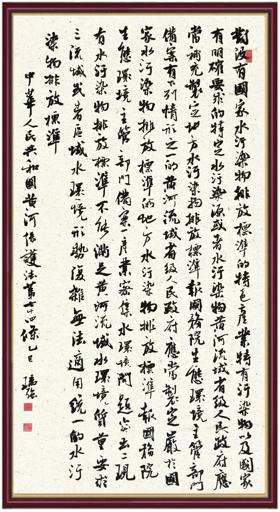 黃河寧,天下平。黃河是中華民族的發(fā)源地和搖籃,保護黃河是事關(guān)中華民族偉大復(fù)興的千秋大計?!吨腥A人民共和國黃河保護法》為推進水資源節(jié)約集約利用、保護傳承弘揚黃河文化、推動黃河流域生態(tài)保護和高質(zhì)量發(fā)展提供了有力法治保障。繼書寫《中華人民共和國民法典》《中華人民共和國憲法》《中華人民共和國澳門特別行政區(qū)基本法》《中華人民共和國香港特別行政區(qū)基本法》《中華人民共和國國旗法》《中華人民共和國國徽法》《中華人民共和國國歌法》《中華人民共和國法官法》等法律法規(guī)之后,法制日報社聯(lián)合沿黃九省(區(qū))司法廳、書法家協(xié)會,將筆端對準(zhǔn)《中華人民共和國黃河保護法》。