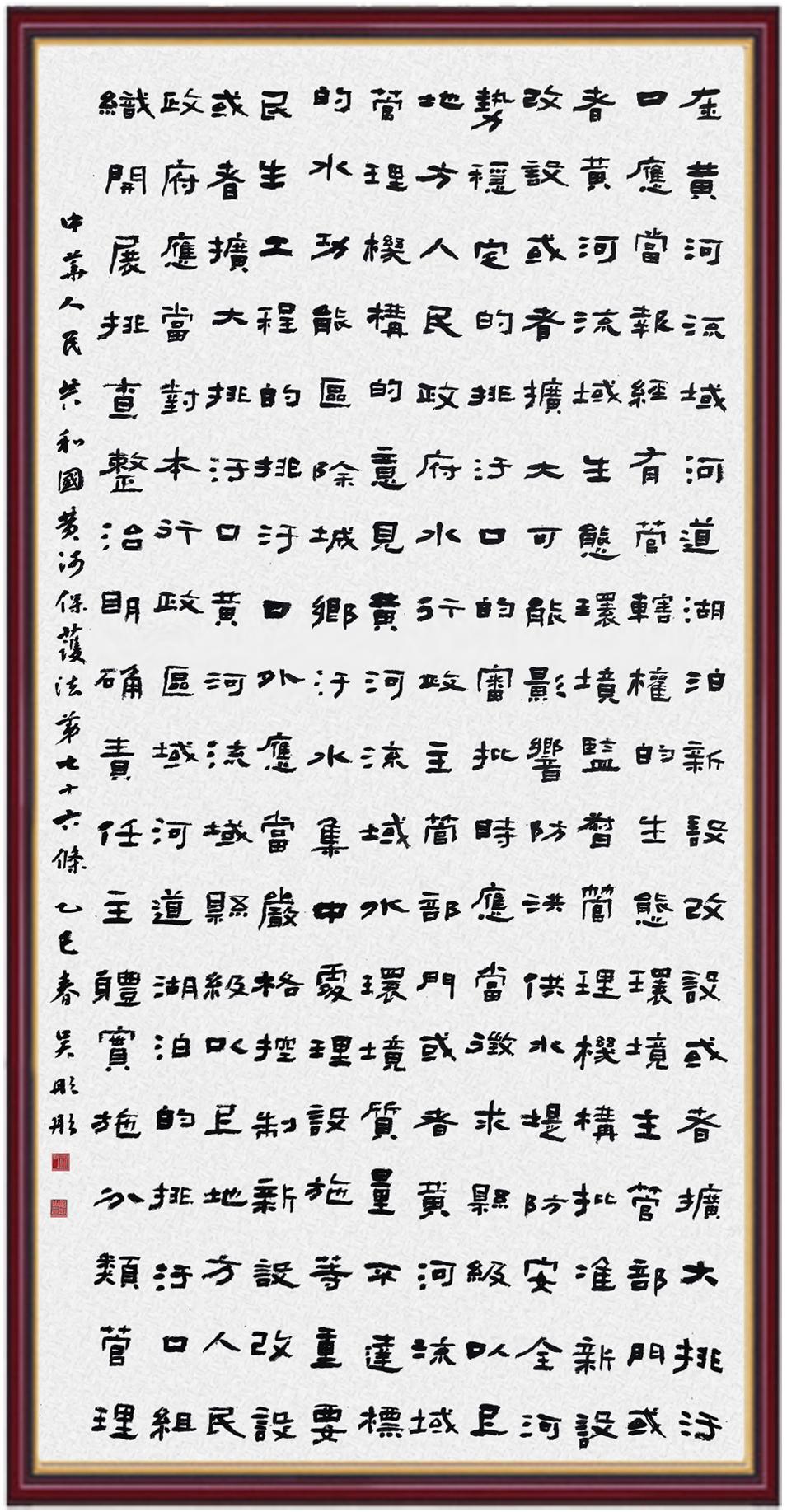 黃河寧,天下平。黃河是中華民族的發(fā)源地和搖籃,保護黃河是事關(guān)中華民族偉大復(fù)興的千秋大計?!吨腥A人民共和國黃河保護法》為推進水資源節(jié)約集約利用、保護傳承弘揚黃河文化、推動黃河流域生態(tài)保護和高質(zhì)量發(fā)展提供了有力法治保障。繼書寫《中華人民共和國民法典》《中華人民共和國憲法》《中華人民共和國澳門特別行政區(qū)基本法》《中華人民共和國香港特別行政區(qū)基本法》《中華人民共和國國旗法》《中華人民共和國國徽法》《中華人民共和國國歌法》《中華人民共和國法官法》等法律法規(guī)之后,法制日報社聯(lián)合沿黃九省(區(qū))司法廳、書法家協(xié)會,將筆端對準《中華人民共和國黃河保護法》。