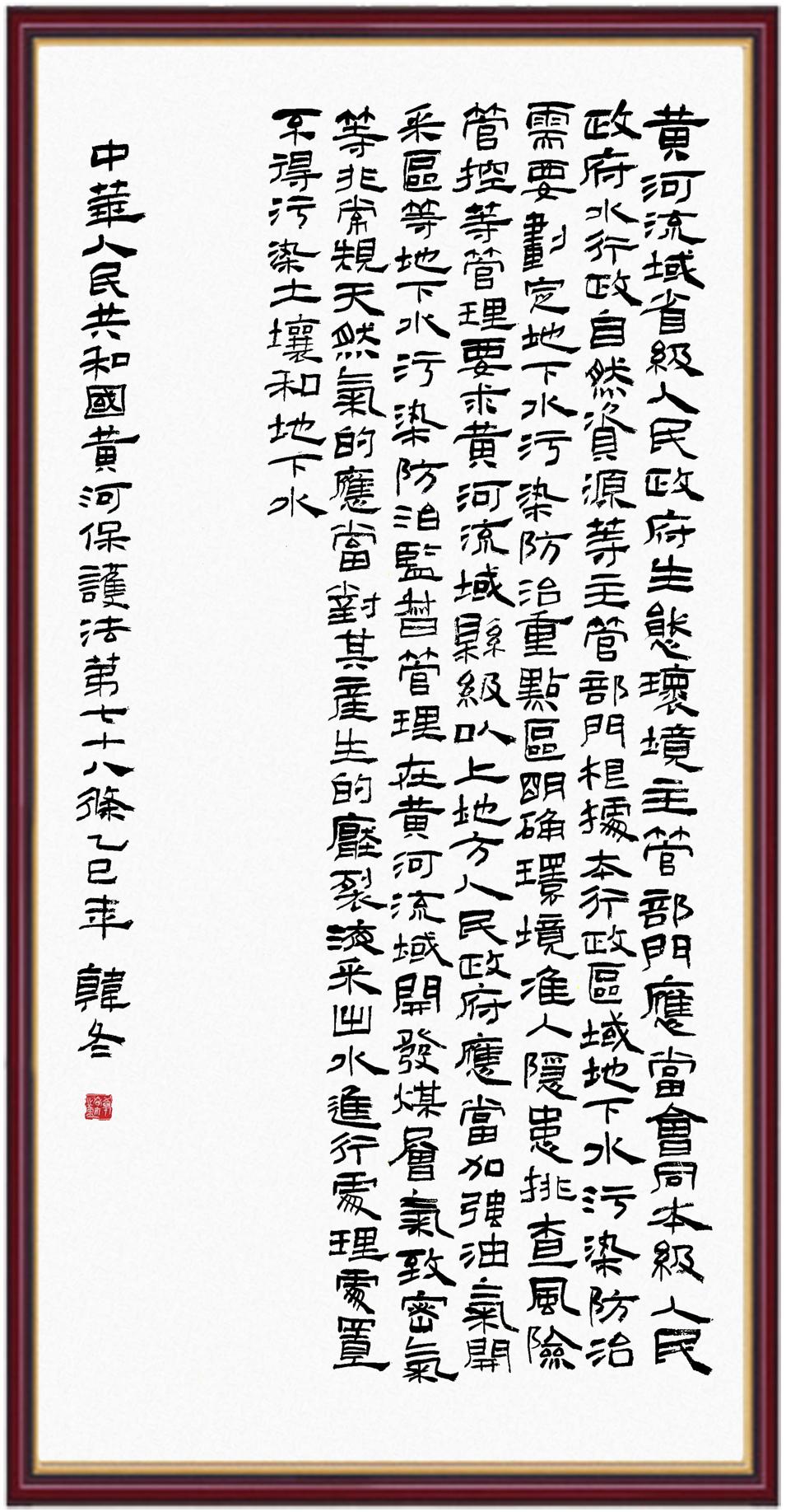 黃河寧,天下平。黃河是中華民族的發(fā)源地和搖籃,保護黃河是事關中華民族偉大復興的千秋大計。《中華人民共和國黃河保護法》為推進水資源節(jié)約集約利用、保護傳承弘揚黃河文化、推動黃河流域生態(tài)保護和高質(zhì)量發(fā)展提供了有力法治保障。繼書寫《中華人民共和國民法典》《中華人民共和國憲法》《中華人民共和國澳門特別行政區(qū)基本法》《中華人民共和國香港特別行政區(qū)基本法》《中華人民共和國國旗法》《中華人民共和國國徽法》《中華人民共和國國歌法》《中華人民共和國法官法》等法律法規(guī)之后,法制日報社聯(lián)合沿黃九?。▍^(qū))司法廳、書法家協(xié)會,將筆端對準《中華人民共和國黃河保護法》。