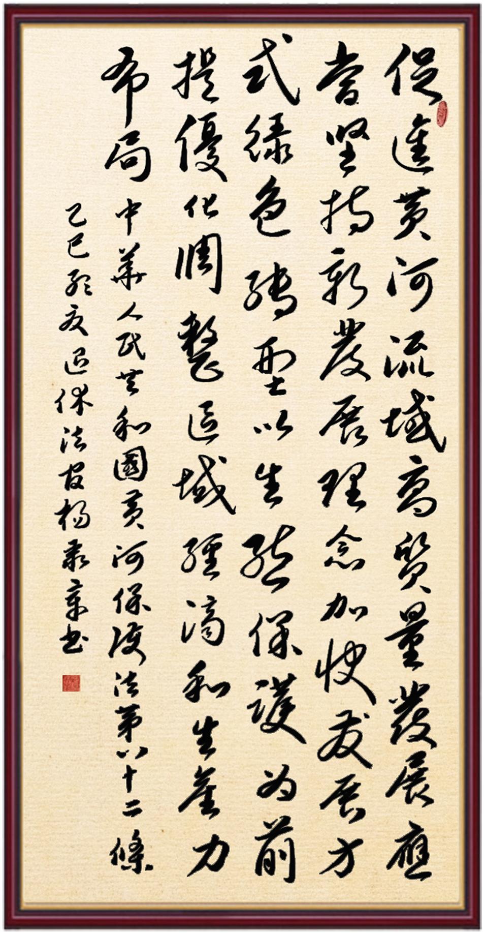 黃河寧,天下平。黃河是中華民族的發(fā)源地和搖籃,保護黃河是事關中華民族偉大復興的千秋大計?!吨腥A人民共和國黃河保護法》為推進水資源節(jié)約集約利用、保護傳承弘揚黃河文化、推動黃河流域生態(tài)保護和高質量發(fā)展提供了有力法治保障。繼書寫《中華人民共和國民法典》《中華人民共和國憲法》《中華人民共和國澳門特別行政區(qū)基本法》《中華人民共和國香港特別行政區(qū)基本法》《中華人民共和國國旗法》《中華人民共和國國徽法》《中華人民共和國國歌法》《中華人民共和國法官法》等法律法規(guī)之后,法制日報社聯(lián)合沿黃九省(區(qū))司法廳、書法家協(xié)會,將筆端對準《中華人民共和國黃河保護法》。