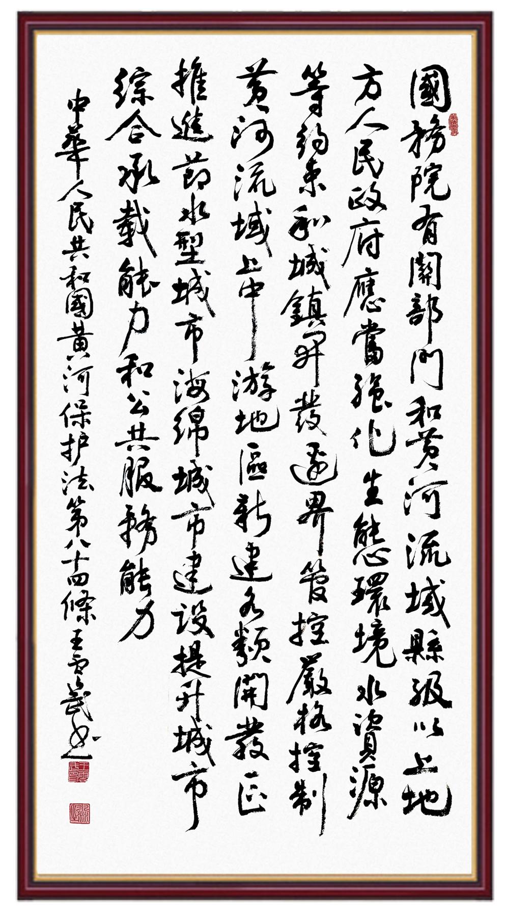黃河寧,天下平。黃河是中華民族的發(fā)源地和搖籃,保護黃河是事關(guān)中華民族偉大復(fù)興的千秋大計?!吨腥A人民共和國黃河保護法》為推進水資源節(jié)約集約利用、保護傳承弘揚黃河文化、推動黃河流域生態(tài)保護和高質(zhì)量發(fā)展提供了有力法治保障。繼書寫《中華人民共和國民法典》《中華人民共和國憲法》《中華人民共和國澳門特別行政區(qū)基本法》《中華人民共和國香港特別行政區(qū)基本法》《中華人民共和國國旗法》《中華人民共和國國徽法》《中華人民共和國國歌法》《中華人民共和國法官法》等法律法規(guī)之后,法制日報社聯(lián)合沿黃九?。▍^(qū))司法廳、書法家協(xié)會,將筆端對準《中華人民共和國黃河保護法》。