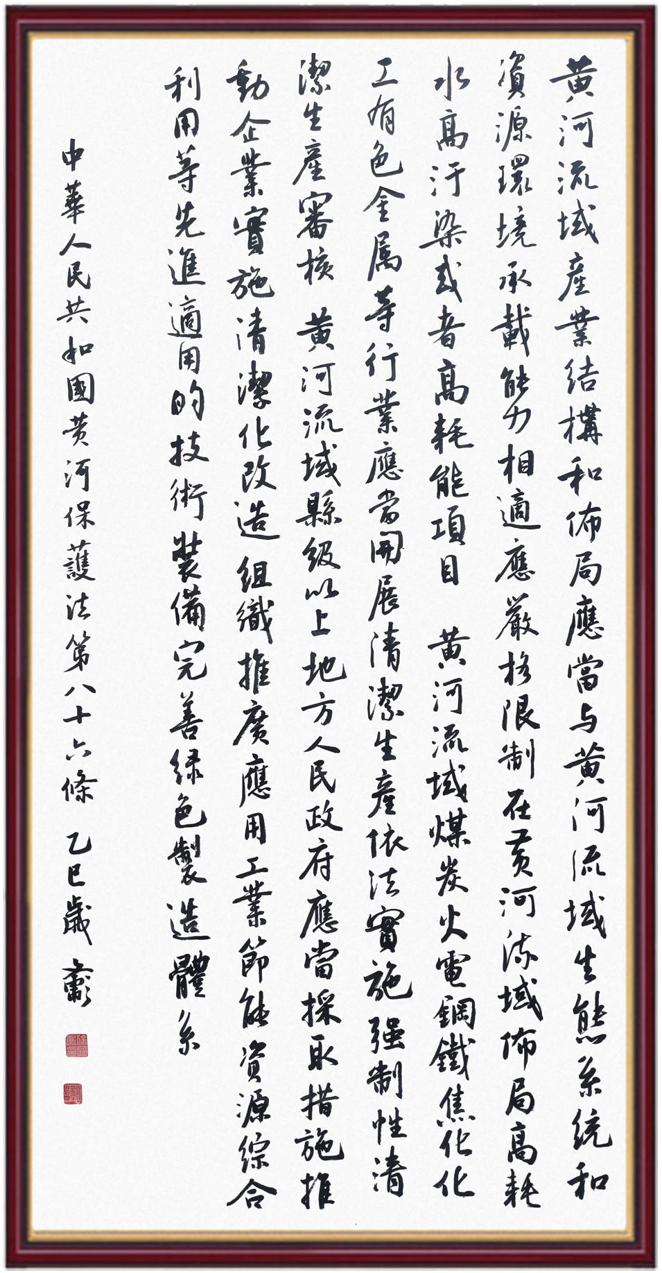 黃河寧,天下平。黃河是中華民族的發(fā)源地和搖籃,保護(hù)黃河是事關(guān)中華民族偉大復(fù)興的千秋大計(jì)?!吨腥A人民共和國(guó)黃河保護(hù)法》為推進(jìn)水資源節(jié)約集約利用、保護(hù)傳承弘揚(yáng)黃河文化、推動(dòng)黃河流域生態(tài)保護(hù)和高質(zhì)量發(fā)展提供了有力法治保障。繼書(shū)寫(xiě)《中華人民共和國(guó)民法典》《中華人民共和國(guó)憲法》《中華人民共和國(guó)澳門特別行政區(qū)基本法》《中華人民共和國(guó)香港特別行政區(qū)基本法》《中華人民共和國(guó)國(guó)旗法》《中華人民共和國(guó)國(guó)徽法》《中華人民共和國(guó)國(guó)歌法》《中華人民共和國(guó)法官法》等法律法規(guī)之后,法制日?qǐng)?bào)社聯(lián)合沿黃九?。▍^(qū))司法廳、書(shū)法家協(xié)會(huì),將筆端對(duì)準(zhǔn)《中華人民共和國(guó)黃河保護(hù)法》。