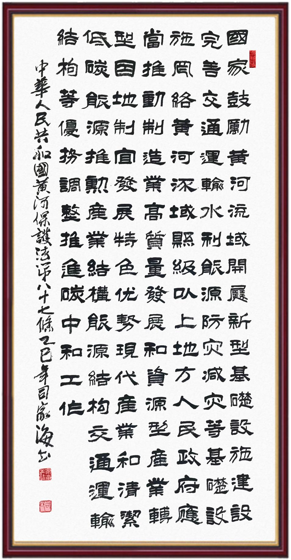 黃河寧,天下平。黃河是中華民族的發(fā)源地和搖籃,保護黃河是事關中華民族偉大復興的千秋大計。《中華人民共和國黃河保護法》為推進水資源節(jié)約集約利用、保護傳承弘揚黃河文化、推動黃河流域生態(tài)保護和高質量發(fā)展提供了有力法治保障。繼書寫《中華人民共和國民法典》《中華人民共和國憲法》《中華人民共和國澳門特別行政區(qū)基本法》《中華人民共和國香港特別行政區(qū)基本法》《中華人民共和國國旗法》《中華人民共和國國徽法》《中華人民共和國國歌法》《中華人民共和國法官法》等法律法規(guī)之后,法制日報社聯(lián)合沿黃九?。▍^(qū))司法廳、書法家協(xié)會,將筆端對準《中華人民共和國黃河保護法》。