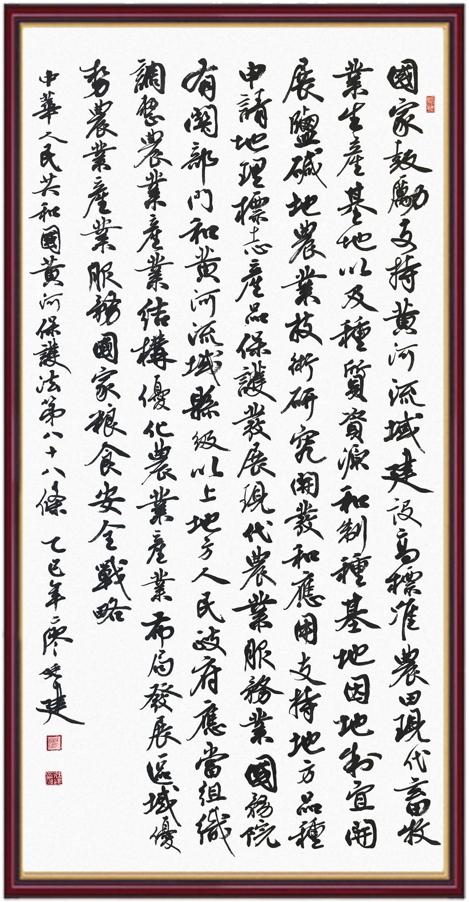 黃河寧,天下平。黃河是中華民族的發(fā)源地和搖籃,保護(hù)黃河是事關(guān)中華民族偉大復(fù)興的千秋大計(jì)?!吨腥A人民共和國(guó)黃河保護(hù)法》為推進(jìn)水資源節(jié)約集約利用、保護(hù)傳承弘揚(yáng)黃河文化、推動(dòng)黃河流域生態(tài)保護(hù)和高質(zhì)量發(fā)展提供了有力法治保障。繼書寫《中華人民共和國(guó)民法典》《中華人民共和國(guó)憲法》《中華人民共和國(guó)澳門特別行政區(qū)基本法》《中華人民共和國(guó)香港特別行政區(qū)基本法》《中華人民共和國(guó)國(guó)旗法》《中華人民共和國(guó)國(guó)徽法》《中華人民共和國(guó)國(guó)歌法》《中華人民共和國(guó)法官法》等法律法規(guī)之后,法制日?qǐng)?bào)社聯(lián)合沿黃九?。▍^(qū))司法廳、書法家協(xié)會(huì),將筆端對(duì)準(zhǔn)《中華人民共和國(guó)黃河保護(hù)法》。