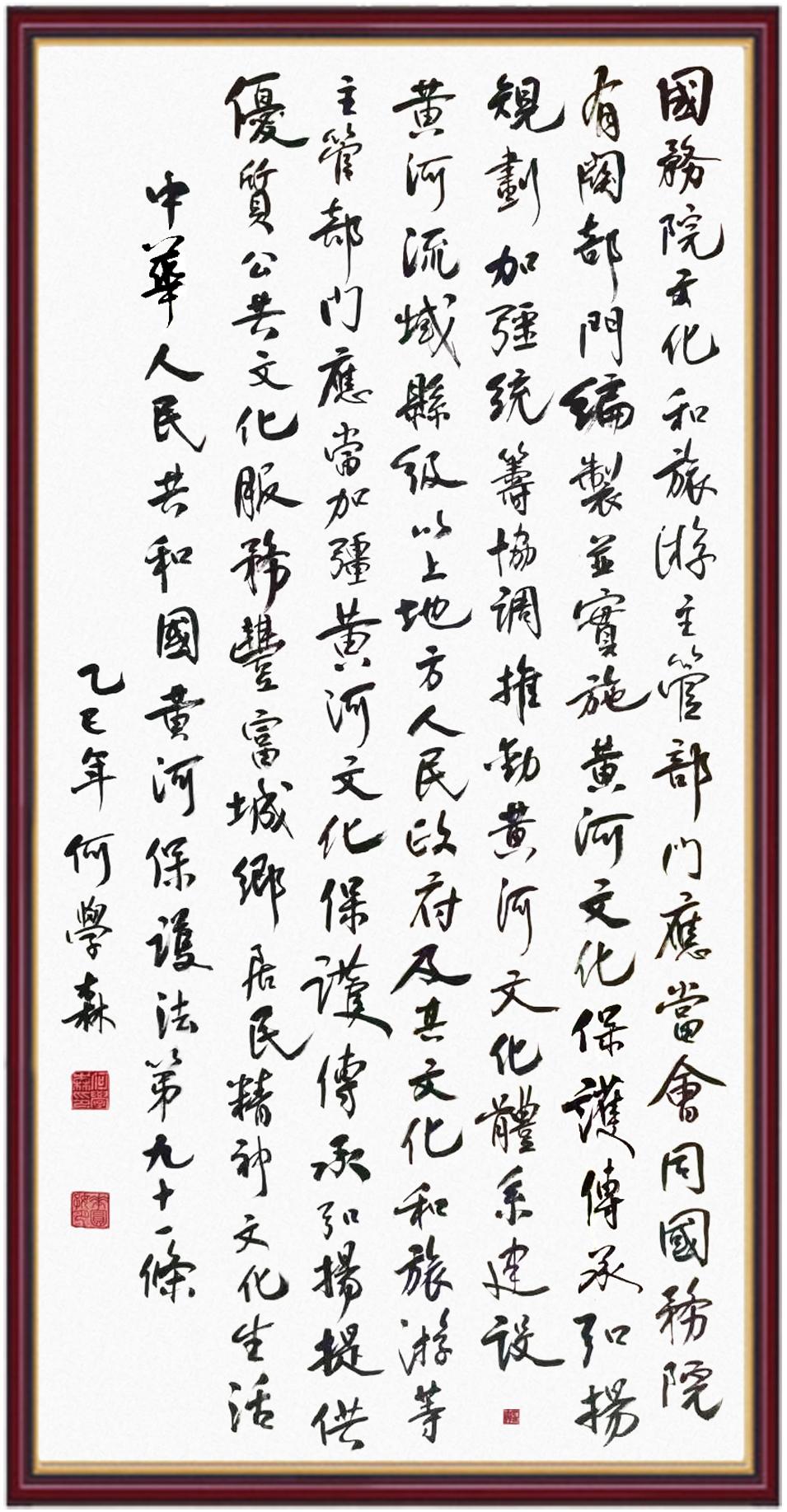 黃河寧,天下平。黃河是中華民族的發(fā)源地和搖籃,保護黃河是事關(guān)中華民族偉大復(fù)興的千秋大計。《中華人民共和國黃河保護法》為推進水資源節(jié)約集約利用、保護傳承弘揚黃河文化、推動黃河流域生態(tài)保護和高質(zhì)量發(fā)展提供了有力法治保障。繼書寫《中華人民共和國民法典》《中華人民共和國憲法》《中華人民共和國澳門特別行政區(qū)基本法》《中華人民共和國香港特別行政區(qū)基本法》《中華人民共和國國旗法》《中華人民共和國國徽法》《中華人民共和國國歌法》《中華人民共和國法官法》等法律法規(guī)之后,法制日報社聯(lián)合沿黃九?。▍^(qū))司法廳、書法家協(xié)會,將筆端對準《中華人民共和國黃河保護法》。