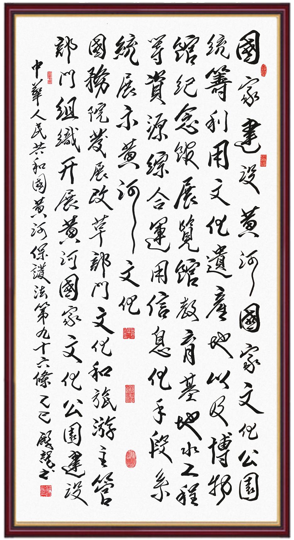 黃河寧,天下平。黃河是中華民族的發(fā)源地和搖籃,保護(hù)黃河是事關(guān)中華民族偉大復(fù)興的千秋大計(jì)?!吨腥A人民共和國黃河保護(hù)法》為推進(jìn)水資源節(jié)約集約利用、保護(hù)傳承弘揚(yáng)黃河文化、推動黃河流域生態(tài)保護(hù)和高質(zhì)量發(fā)展提供了有力法治保障。繼書寫《中華人民共和國民法典》《中華人民共和國憲法》《中華人民共和國澳門特別行政區(qū)基本法》《中華人民共和國香港特別行政區(qū)基本法》《中華人民共和國國旗法》《中華人民共和國國徽法》《中華人民共和國國歌法》《中華人民共和國法官法》等法律法規(guī)之后,法制日報(bào)社聯(lián)合沿黃九省(區(qū))司法廳、書法家協(xié)會,將筆端對準(zhǔn)《中華人民共和國黃河保護(hù)法》。