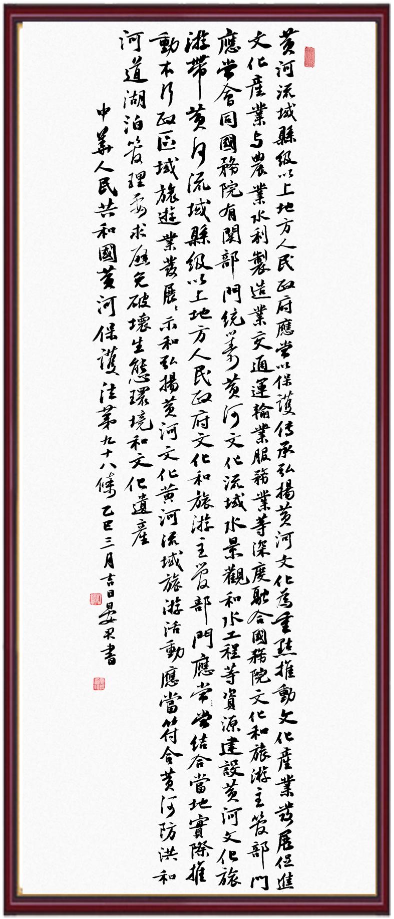 黃河寧,天下平。黃河是中華民族的發(fā)源地和搖籃,保護(hù)黃河是事關(guān)中華民族偉大復(fù)興的千秋大計。《中華人民共和國黃河保護(hù)法》為推進(jìn)水資源節(jié)約集約利用、保護(hù)傳承弘揚黃河文化、推動黃河流域生態(tài)保護(hù)和高質(zhì)量發(fā)展提供了有力法治保障。繼書寫《中華人民共和國民法典》《中華人民共和國憲法》《中華人民共和國澳門特別行政區(qū)基本法》《中華人民共和國香港特別行政區(qū)基本法》《中華人民共和國國旗法》《中華人民共和國國徽法》《中華人民共和國國歌法》《中華人民共和國法官法》等法律法規(guī)之后,法制日報社聯(lián)合沿黃九?。▍^(qū))司法廳、書法家協(xié)會,將筆端對準(zhǔn)《中華人民共和國黃河保護(hù)法》。