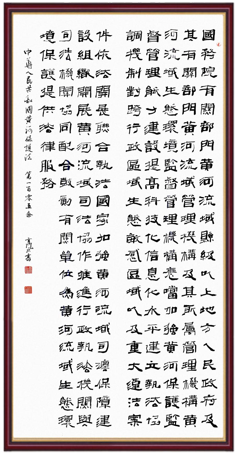 黃河寧,天下平。黃河是中華民族的發(fā)源地和搖籃,保護黃河是事關(guān)中華民族偉大復(fù)興的千秋大計?!吨腥A人民共和國黃河保護法》為推進水資源節(jié)約集約利用、保護傳承弘揚黃河文化、推動黃河流域生態(tài)保護和高質(zhì)量發(fā)展提供了有力法治保障。繼書寫《中華人民共和國民法典》《中華人民共和國憲法》《中華人民共和國澳門特別行政區(qū)基本法》《中華人民共和國香港特別行政區(qū)基本法》《中華人民共和國國旗法》《中華人民共和國國徽法》《中華人民共和國國歌法》《中華人民共和國法官法》等法律法規(guī)之后,法制日報社聯(lián)合沿黃九?。▍^(qū))司法廳、書法家協(xié)會,將筆端對準(zhǔn)《中華人民共和國黃河保護法》。