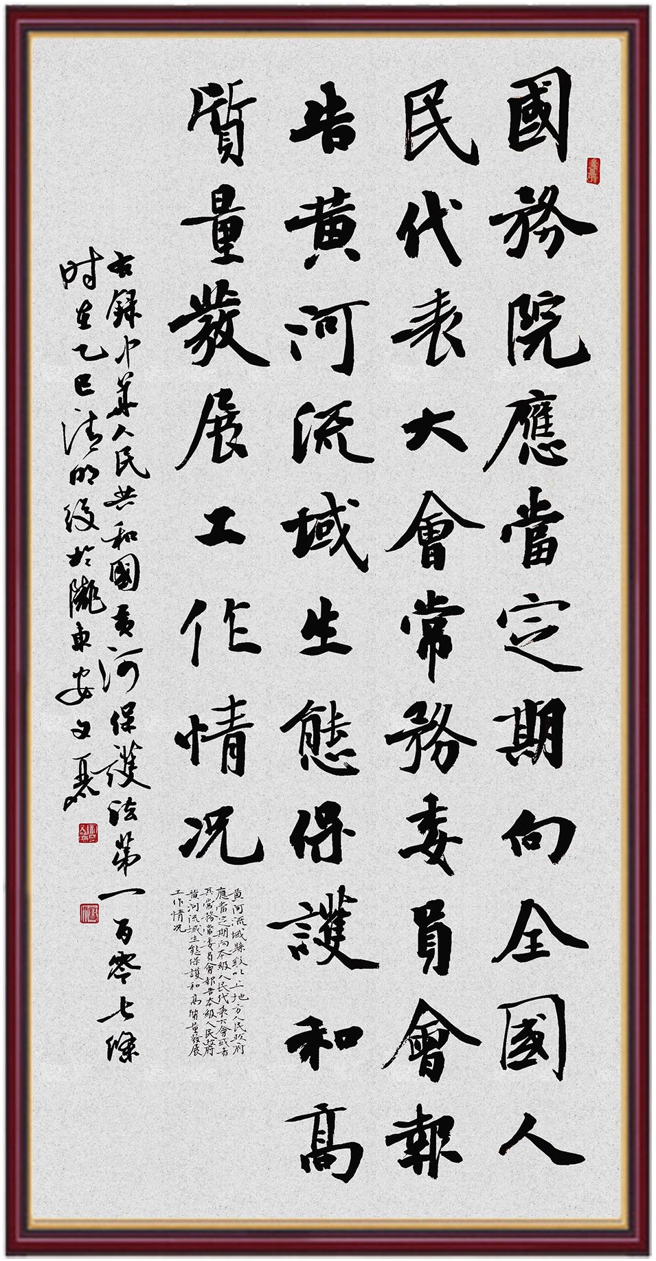黃河寧,天下平。黃河是中華民族的發(fā)源地和搖籃,保護(hù)黃河是事關(guān)中華民族偉大復(fù)興的千秋大計(jì)?!吨腥A人民共和國(guó)黃河保護(hù)法》為推進(jìn)水資源節(jié)約集約利用、保護(hù)傳承弘揚(yáng)黃河文化、推動(dòng)黃河流域生態(tài)保護(hù)和高質(zhì)量發(fā)展提供了有力法治保障。繼書寫《中華人民共和國(guó)民法典》《中華人民共和國(guó)憲法》《中華人民共和國(guó)澳門特別行政區(qū)基本法》《中華人民共和國(guó)香港特別行政區(qū)基本法》《中華人民共和國(guó)國(guó)旗法》《中華人民共和國(guó)國(guó)徽法》《中華人民共和國(guó)國(guó)歌法》《中華人民共和國(guó)法官法》等法律法規(guī)之后,法制日?qǐng)?bào)社聯(lián)合沿黃九?。▍^(qū))司法廳、書法家協(xié)會(huì),將筆端對(duì)準(zhǔn)《中華人民共和國(guó)黃河保護(hù)法》。