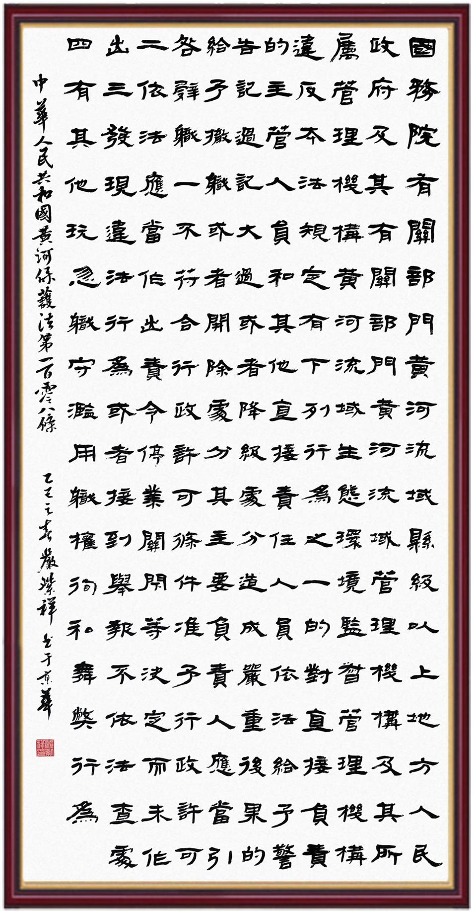 黃河寧,天下平。黃河是中華民族的發(fā)源地和搖籃,保護(hù)黃河是事關(guān)中華民族偉大復(fù)興的千秋大計(jì)?!吨腥A人民共和國(guó)黃河保護(hù)法》為推進(jìn)水資源節(jié)約集約利用、保護(hù)傳承弘揚(yáng)黃河文化、推動(dòng)黃河流域生態(tài)保護(hù)和高質(zhì)量發(fā)展提供了有力法治保障。繼書寫《中華人民共和國(guó)民法典》《中華人民共和國(guó)憲法》《中華人民共和國(guó)澳門特別行政區(qū)基本法》《中華人民共和國(guó)香港特別行政區(qū)基本法》《中華人民共和國(guó)國(guó)旗法》《中華人民共和國(guó)國(guó)徽法》《中華人民共和國(guó)國(guó)歌法》《中華人民共和國(guó)法官法》等法律法規(guī)之后,法制日?qǐng)?bào)社聯(lián)合沿黃九?。▍^(qū))司法廳、書法家協(xié)會(huì),將筆端對(duì)準(zhǔn)《中華人民共和國(guó)黃河保護(hù)法》。