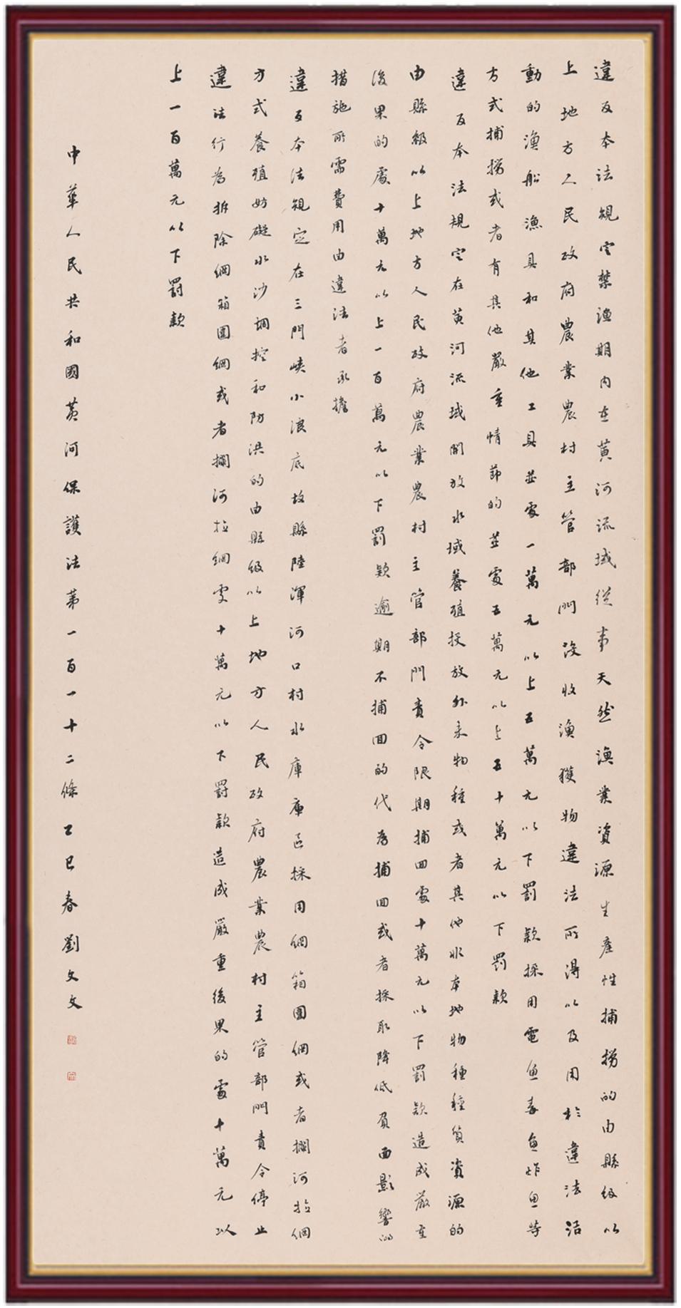 黃河寧,天下平。黃河是中華民族的發(fā)源地和搖籃,保護黃河是事關(guān)中華民族偉大復興的千秋大計。《中華人民共和國黃河保護法》為推進水資源節(jié)約集約利用、保護傳承弘揚黃河文化、推動黃河流域生態(tài)保護和高質(zhì)量發(fā)展提供了有力法治保障。繼書寫《中華人民共和國民法典》《中華人民共和國憲法》《中華人民共和國澳門特別行政區(qū)基本法》《中華人民共和國香港特別行政區(qū)基本法》《中華人民共和國國旗法》《中華人民共和國國徽法》《中華人民共和國國歌法》《中華人民共和國法官法》等法律法規(guī)之后,法制日報社聯(lián)合沿黃九?。▍^(qū))司法廳、書法家協(xié)會,將筆端對準《中華人民共和國黃河保護法》。
