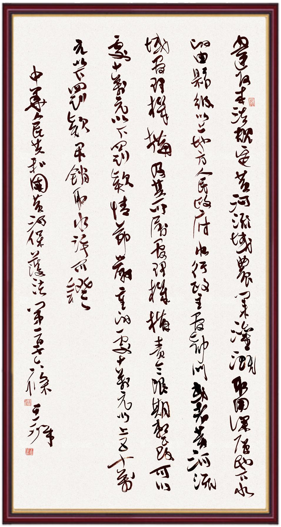 黃河寧,天下平。黃河是中華民族的發(fā)源地和搖籃,保護(hù)黃河是事關(guān)中華民族偉大復(fù)興的千秋大計(jì)。《中華人民共和國黃河保護(hù)法》為推進(jìn)水資源節(jié)約集約利用、保護(hù)傳承弘揚(yáng)黃河文化、推動黃河流域生態(tài)保護(hù)和高質(zhì)量發(fā)展提供了有力法治保障。繼書寫《中華人民共和國民法典》《中華人民共和國憲法》《中華人民共和國澳門特別行政區(qū)基本法》《中華人民共和國香港特別行政區(qū)基本法》《中華人民共和國國旗法》《中華人民共和國國徽法》《中華人民共和國國歌法》《中華人民共和國法官法》等法律法規(guī)之后,法制日報(bào)社聯(lián)合沿黃九?。▍^(qū))司法廳、書法家協(xié)會,將筆端對準(zhǔn)《中華人民共和國黃河保護(hù)法》。