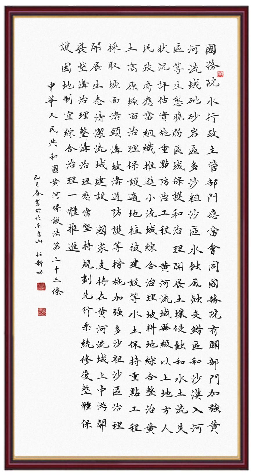 黃河寧,天下平。黃河是中華民族的發(fā)源地和搖籃,保護(hù)黃河是事關(guān)中華民族偉大復(fù)興的千秋大計(jì)?!吨腥A人民共和國黃河保護(hù)法》為推進(jìn)水資源節(jié)約集約利用、保護(hù)傳承弘揚(yáng)黃河文化、推動(dòng)黃河流域生態(tài)保護(hù)和高質(zhì)量發(fā)展提供了有力法治保障。繼書寫《中華人民共和國民法典》《中華人民共和國憲法》《中華人民共和國澳門特別行政區(qū)基本法》《中華人民共和國香港特別行政區(qū)基本法》《中華人民共和國國旗法》《中華人民共和國國徽法》《中華人民共和國國歌法》《中華人民共和國法官法》等法律法規(guī)之后,法制日?qǐng)?bào)社聯(lián)合沿黃九?。▍^(qū))司法廳、書法家協(xié)會(huì),將筆端對(duì)準(zhǔn)《中華人民共和國黃河保護(hù)法》。
