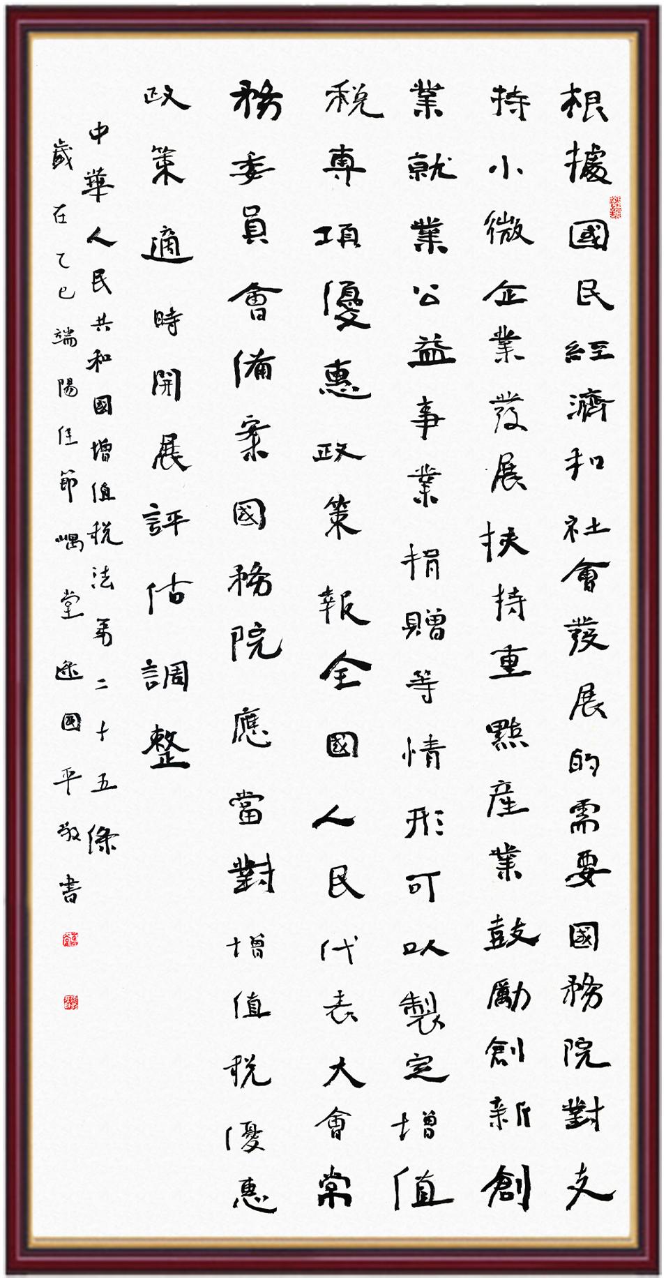 稅收一頭連著國計,一頭連著民生。全面推進依法治稅,是全面依法治國基本方略在稅收領(lǐng)域的集中體現(xiàn)。《中華人民共和國增值稅法》將于2026年1月1日起施行,對全面落實稅收法定原則、健全有利于高質(zhì)量發(fā)展的增值稅制度、規(guī)范增值稅的征收和繳納、保護納稅人合法權(quán)益具有重要意義。繼書寫《中華人民共和國民法典》《中華人民共和國憲法》《中華人民共和國國旗法》《中華人民共和國國徽法》《中華人民共和國國歌法》《中華人民共和國法官法》《中華人民共和國黃河保護法》等法律法規(guī)之后,法制日報社將筆端對準《中華人民共和國增值稅法》。