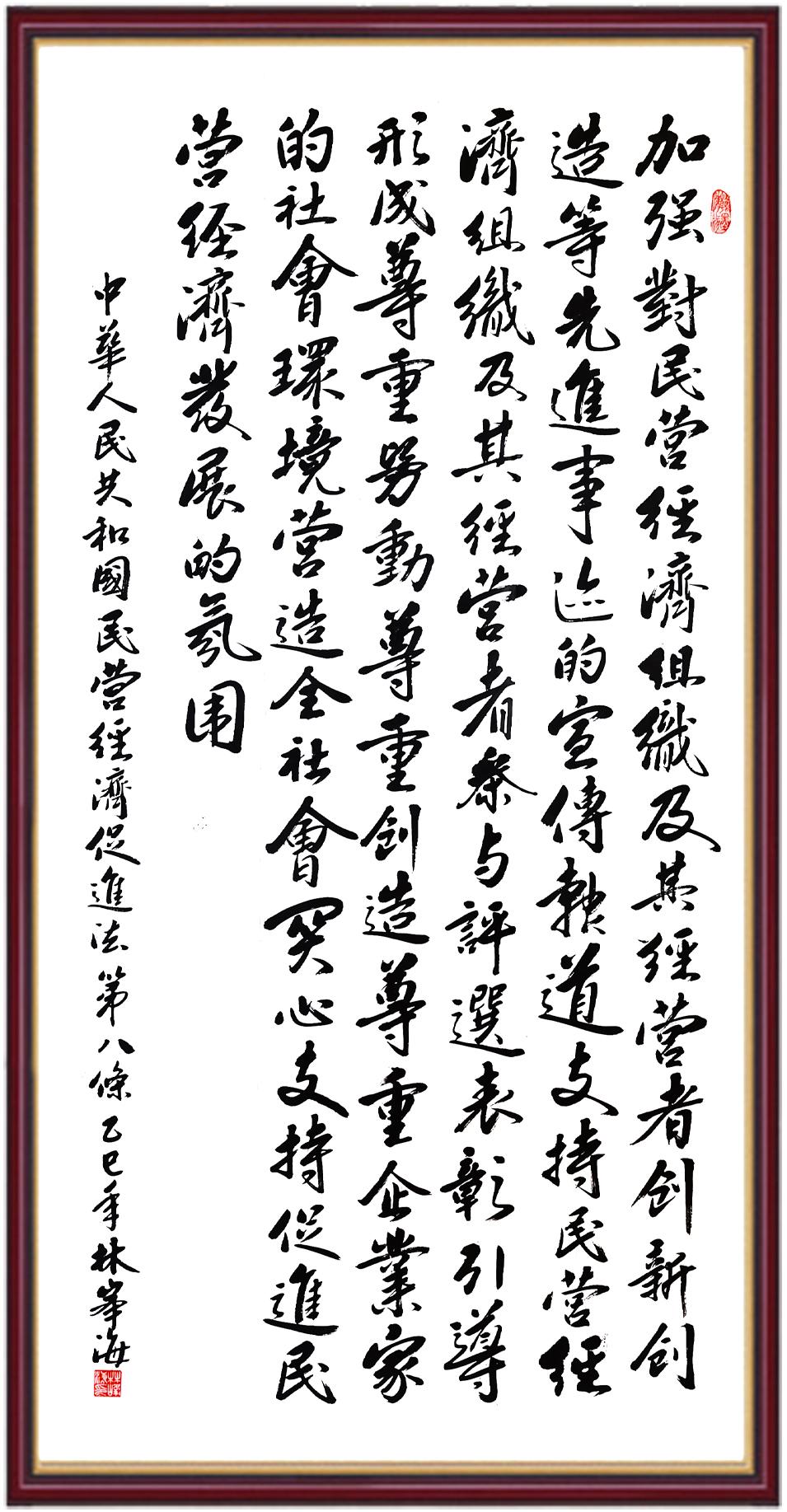《中華人民共和國民營經(jīng)濟(jì)促進(jìn)法》自今年5月20日起施行。作為我國首部專門關(guān)于民營經(jīng)濟(jì)發(fā)展的基礎(chǔ)性法律,民營經(jīng)濟(jì)促進(jìn)法將支持和保障民營經(jīng)濟(jì)發(fā)展的法律制度融入中國特色社會主義法律體系,具有重大的法治意義,為促進(jìn)民營經(jīng)濟(jì)持續(xù)、健康、高質(zhì)量發(fā)展提供了堅(jiān)實(shí)的法治保障。為更好地學(xué)習(xí)、宣傳、貫徹這部法律,法治日報(bào)社聯(lián)合司法部普法與依法治理局,開展“‘書·法’系列活動之書寫《中華人民共和國民營經(jīng)濟(jì)促進(jìn)法》”活動。