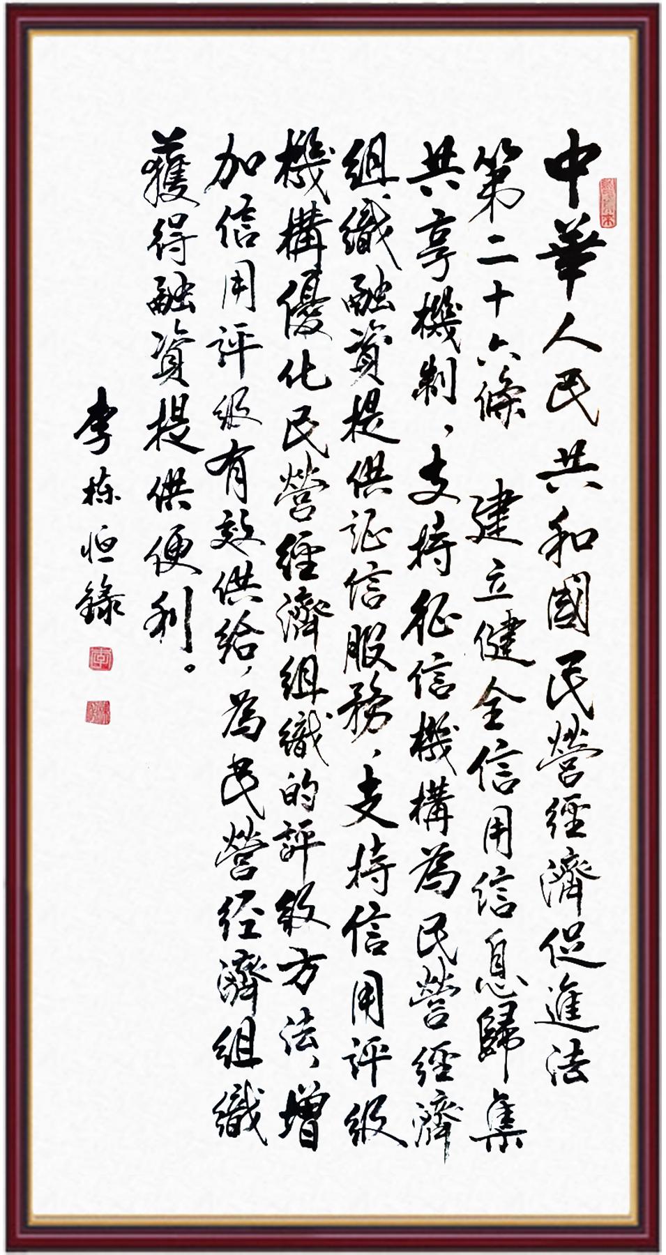 《中華人民共和國(guó)民營(yíng)經(jīng)濟(jì)促進(jìn)法》自今年5月20日起施行。作為我國(guó)首部專(zhuān)門(mén)關(guān)于民營(yíng)經(jīng)濟(jì)發(fā)展的基礎(chǔ)性法律,民營(yíng)經(jīng)濟(jì)促進(jìn)法將支持和保障民營(yíng)經(jīng)濟(jì)發(fā)展的法律制度融入中國(guó)特色社會(huì)主義法律體系,具有重大的法治意義,為促進(jìn)民營(yíng)經(jīng)濟(jì)持續(xù)、健康、高質(zhì)量發(fā)展提供了堅(jiān)實(shí)的法治保障。為更好地學(xué)習(xí)、宣傳、貫徹這部法律,法治日?qǐng)?bào)社聯(lián)合司法部普法與依法治理局,開(kāi)展“‘書(shū)·法’系列活動(dòng)之書(shū)寫(xiě)《中華人民共和國(guó)民營(yíng)經(jīng)濟(jì)促進(jìn)法》”活動(dòng)。