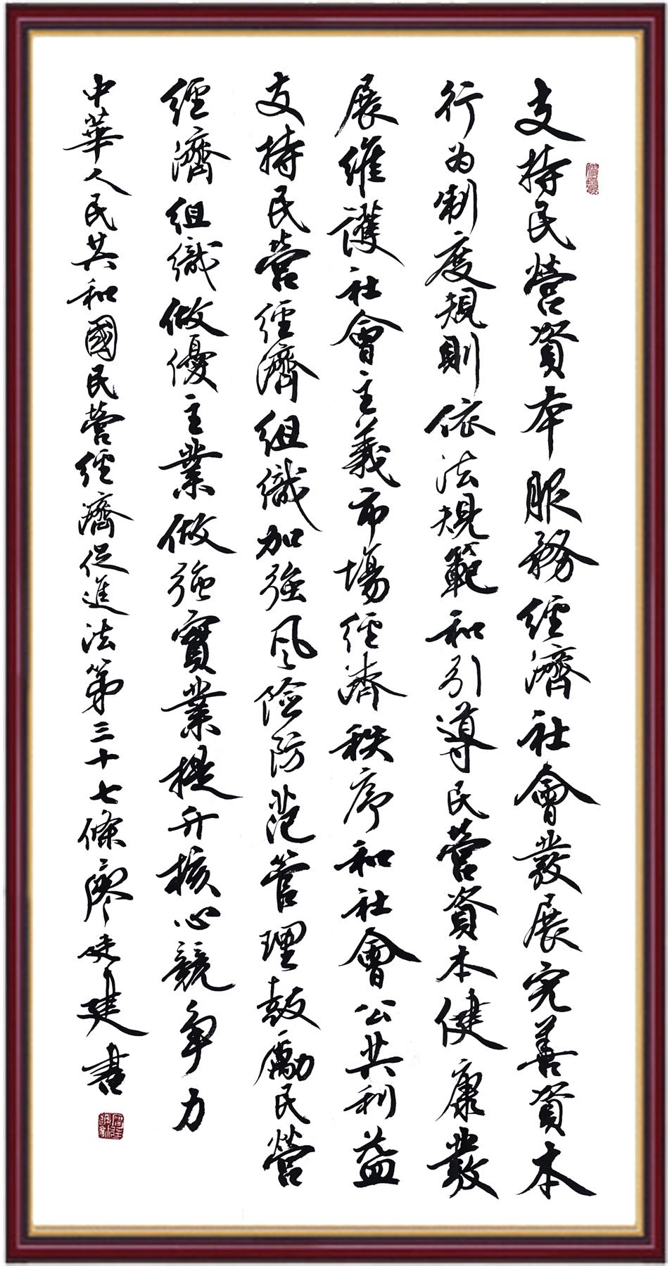 《中華人民共和國(guó)民營(yíng)經(jīng)濟(jì)促進(jìn)法》自今年5月20日起施行。作為我國(guó)首部專(zhuān)門(mén)關(guān)于民營(yíng)經(jīng)濟(jì)發(fā)展的基礎(chǔ)性法律,民營(yíng)經(jīng)濟(jì)促進(jìn)法將支持和保障民營(yíng)經(jīng)濟(jì)發(fā)展的法律制度融入中國(guó)特色社會(huì)主義法律體系,具有重大的法治意義,為促進(jìn)民營(yíng)經(jīng)濟(jì)持續(xù)、健康、高質(zhì)量發(fā)展提供了堅(jiān)實(shí)的法治保障。為更好地學(xué)習(xí)、宣傳、貫徹這部法律,法治日?qǐng)?bào)社聯(lián)合司法部普法與依法治理局,開(kāi)展“‘書(shū)·法’系列活動(dòng)之書(shū)寫(xiě)《中華人民共和國(guó)民營(yíng)經(jīng)濟(jì)促進(jìn)法》”活動(dòng)。