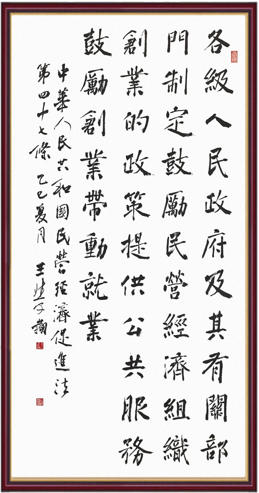 《中華人民共和國民營經(jīng)濟(jì)促進(jìn)法》自今年5月20日起施行。作為我國首部專門關(guān)于民營經(jīng)濟(jì)發(fā)展的基礎(chǔ)性法律,民營經(jīng)濟(jì)促進(jìn)法將支持和保障民營經(jīng)濟(jì)發(fā)展的法律制度融入中國特色社會主義法律體系,具有重大的法治意義,為促進(jìn)民營經(jīng)濟(jì)持續(xù)、健康、高質(zhì)量發(fā)展提供了堅實的法治保障。為更好地學(xué)習(xí)、宣傳、貫徹這部法律,法治日報社聯(lián)合司法部普法與依法治理局,開展“‘書·法’系列活動之書寫《中華人民共和國民營經(jīng)濟(jì)促進(jìn)法》”活動。