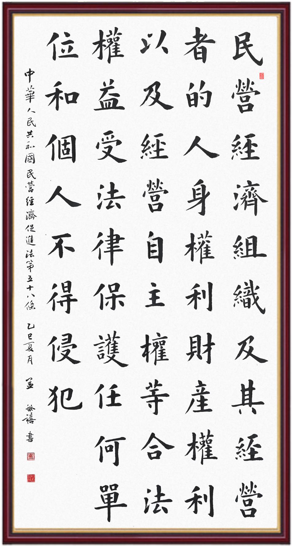 《中華人民共和國民營經(jīng)濟促進法》自今年5月20日起施行。作為我國首部專門關(guān)于民營經(jīng)濟發(fā)展的基礎(chǔ)性法律,民營經(jīng)濟促進法將支持和保障民營經(jīng)濟發(fā)展的法律制度融入中國特色社會主義法律體系,具有重大的法治意義,為促進民營經(jīng)濟持續(xù)、健康、高質(zhì)量發(fā)展提供了堅實的法治保障。為更好地學(xué)習、宣傳、貫徹這部法律,法治日報社聯(lián)合司法部普法與依法治理局,開展“‘書·法’系列活動之書寫《中華人民共和國民營經(jīng)濟促進法》”活動。