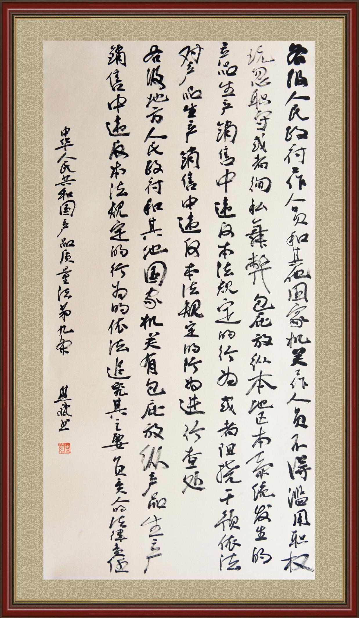 《中華人民共和國產(chǎn)品質(zhì)量法》自1993年9月1日起開始施行,先后進行三次修正。作為產(chǎn)品質(zhì)量領(lǐng)域的基本法律,產(chǎn)品質(zhì)量法對規(guī)范產(chǎn)品質(zhì)量管理、維護消費者合法權(quán)益、促進經(jīng)濟社會發(fā)展具有重要意義。為更好地學(xué)習(xí)、宣傳、貫徹這部法律,在國家市場監(jiān)督管理總局法規(guī)司的支持下,法治日報社開展了“‘書·法’系列活動之書寫《中華人民共和國產(chǎn)品質(zhì)量法》”活動。