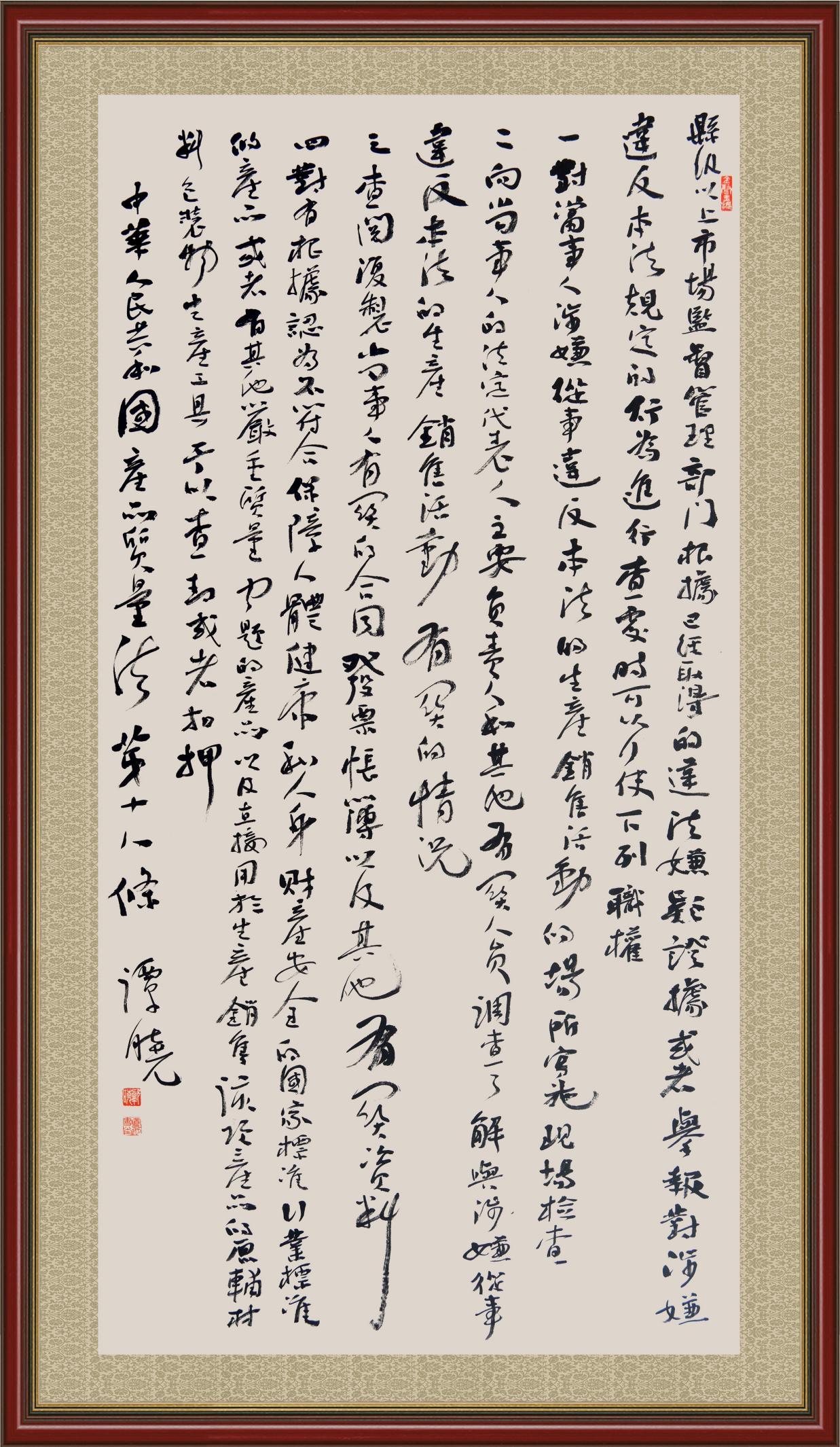 《中華人民共和國(guó)產(chǎn)品質(zhì)量法》自1993年9月1日起開(kāi)始施行,先后進(jìn)行三次修正。作為產(chǎn)品質(zhì)量領(lǐng)域的基本法律,產(chǎn)品質(zhì)量法對(duì)規(guī)范產(chǎn)品質(zhì)量管理、維護(hù)消費(fèi)者合法權(quán)益、促進(jìn)經(jīng)濟(jì)社會(huì)發(fā)展具有重要意義。為更好地學(xué)習(xí)、宣傳、貫徹這部法律,在國(guó)家市場(chǎng)監(jiān)督管理總局法規(guī)司的支持下,法治日?qǐng)?bào)社開(kāi)展了“‘書(shū)·法’系列活動(dòng)之書(shū)寫(xiě)《中華人民共和國(guó)產(chǎn)品質(zhì)量法》”活動(dòng)。