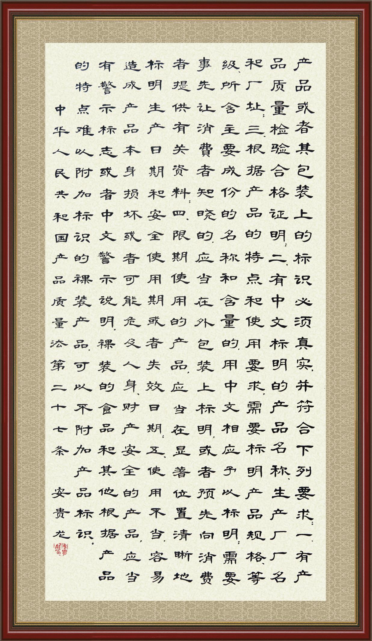 《中華人民共和國產(chǎn)品質(zhì)量法》自1993年9月1日起開始施行,先后進行三次修正。作為產(chǎn)品質(zhì)量領(lǐng)域的基本法律,產(chǎn)品質(zhì)量法對規(guī)范產(chǎn)品質(zhì)量管理、維護消費者合法權(quán)益、促進經(jīng)濟社會發(fā)展具有重要意義。為更好地學習、宣傳、貫徹這部法律,在國家市場監(jiān)督管理總局法規(guī)司的支持下,法治日報社開展了“‘書·法’系列活動之書寫《中華人民共和國產(chǎn)品質(zhì)量法》”活動。