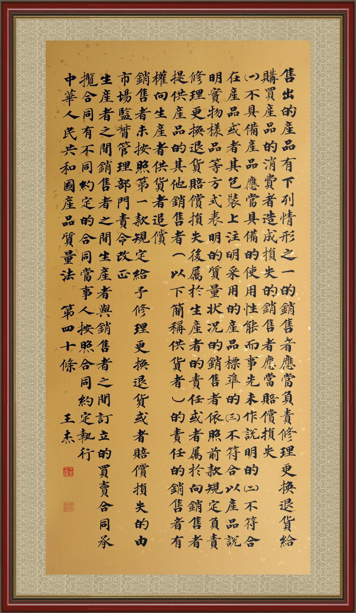 《中華人民共和國產(chǎn)品質(zhì)量法》自1993年9月1日起開始施行,先后進行三次修正。作為產(chǎn)品質(zhì)量領(lǐng)域的基本法律,產(chǎn)品質(zhì)量法對規(guī)范產(chǎn)品質(zhì)量管理、維護消費者合法權(quán)益、促進經(jīng)濟社會發(fā)展具有重要意義。為更好地學(xué)習(xí)、宣傳、貫徹這部法律,在國家市場監(jiān)督管理總局法規(guī)司的支持下,法治日報社開展了“‘書·法’系列活動之書寫《中華人民共和國產(chǎn)品質(zhì)量法》”活動。
