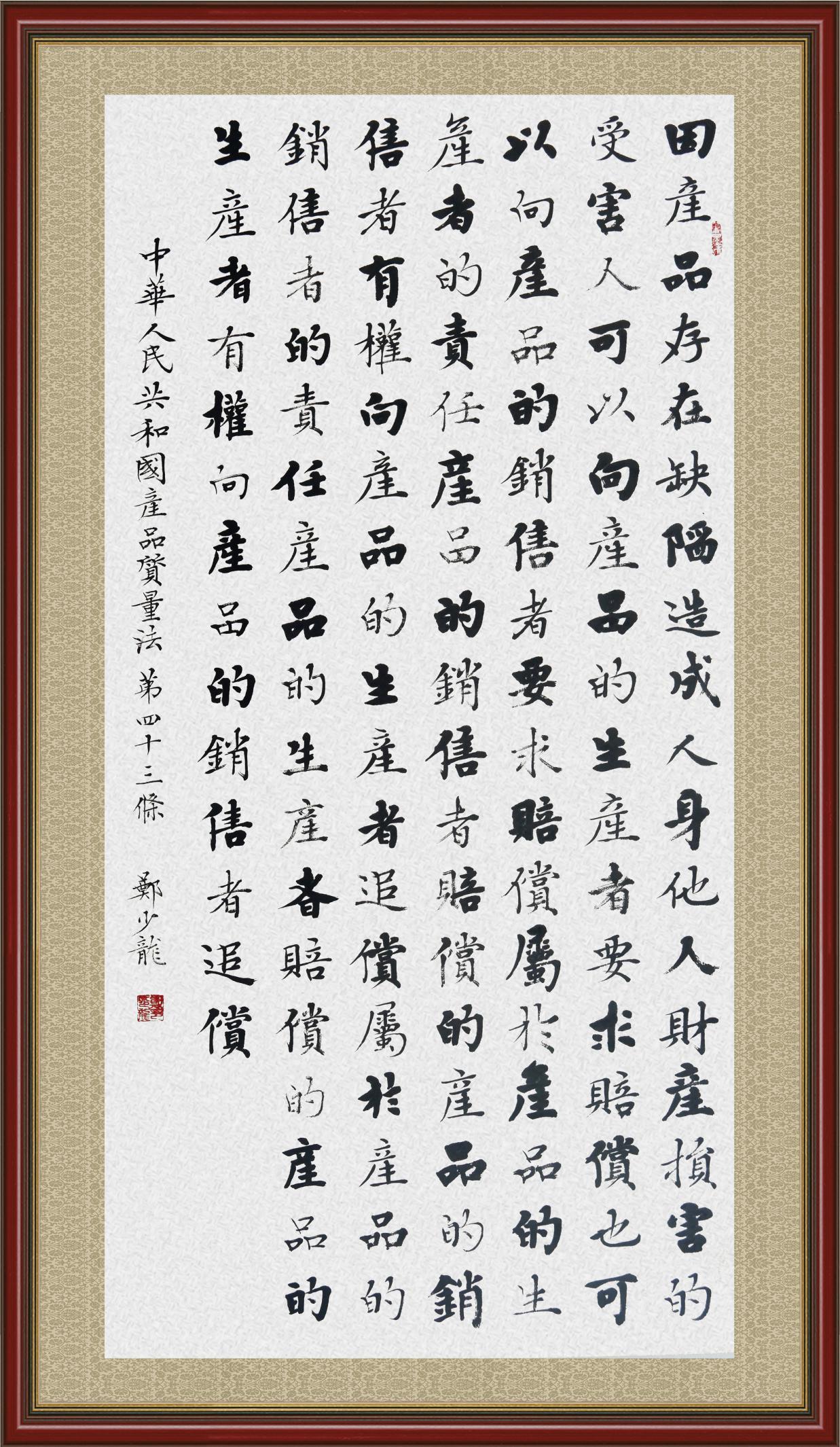 《中華人民共和國產(chǎn)品質(zhì)量法》自1993年9月1日起開始施行,先后進(jìn)行三次修正。作為產(chǎn)品質(zhì)量領(lǐng)域的基本法律,產(chǎn)品質(zhì)量法對規(guī)范產(chǎn)品質(zhì)量管理、維護(hù)消費(fèi)者合法權(quán)益、促進(jìn)經(jīng)濟(jì)社會發(fā)展具有重要意義。為更好地學(xué)習(xí)、宣傳、貫徹這部法律,在國家市場監(jiān)督管理總局法規(guī)司的支持下,法治日報社開展了“‘書·法’系列活動之書寫《中華人民共和國產(chǎn)品質(zhì)量法》”活動。