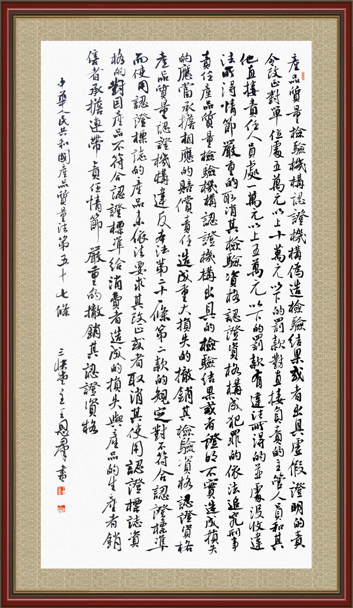 《中華人民共和國產(chǎn)品質(zhì)量法》自1993年9月1日起開始施行,先后進(jìn)行三次修正。作為產(chǎn)品質(zhì)量領(lǐng)域的基本法律,產(chǎn)品質(zhì)量法對規(guī)范產(chǎn)品質(zhì)量管理、維護(hù)消費(fèi)者合法權(quán)益、促進(jìn)經(jīng)濟(jì)社會(huì)發(fā)展具有重要意義。為更好地學(xué)習(xí)、宣傳、貫徹這部法律,在國家市場監(jiān)督管理總局法規(guī)司的支持下,法治日報(bào)社開展了“‘書·法’系列活動(dòng)之書寫《中華人民共和國產(chǎn)品質(zhì)量法》”活動(dòng)。