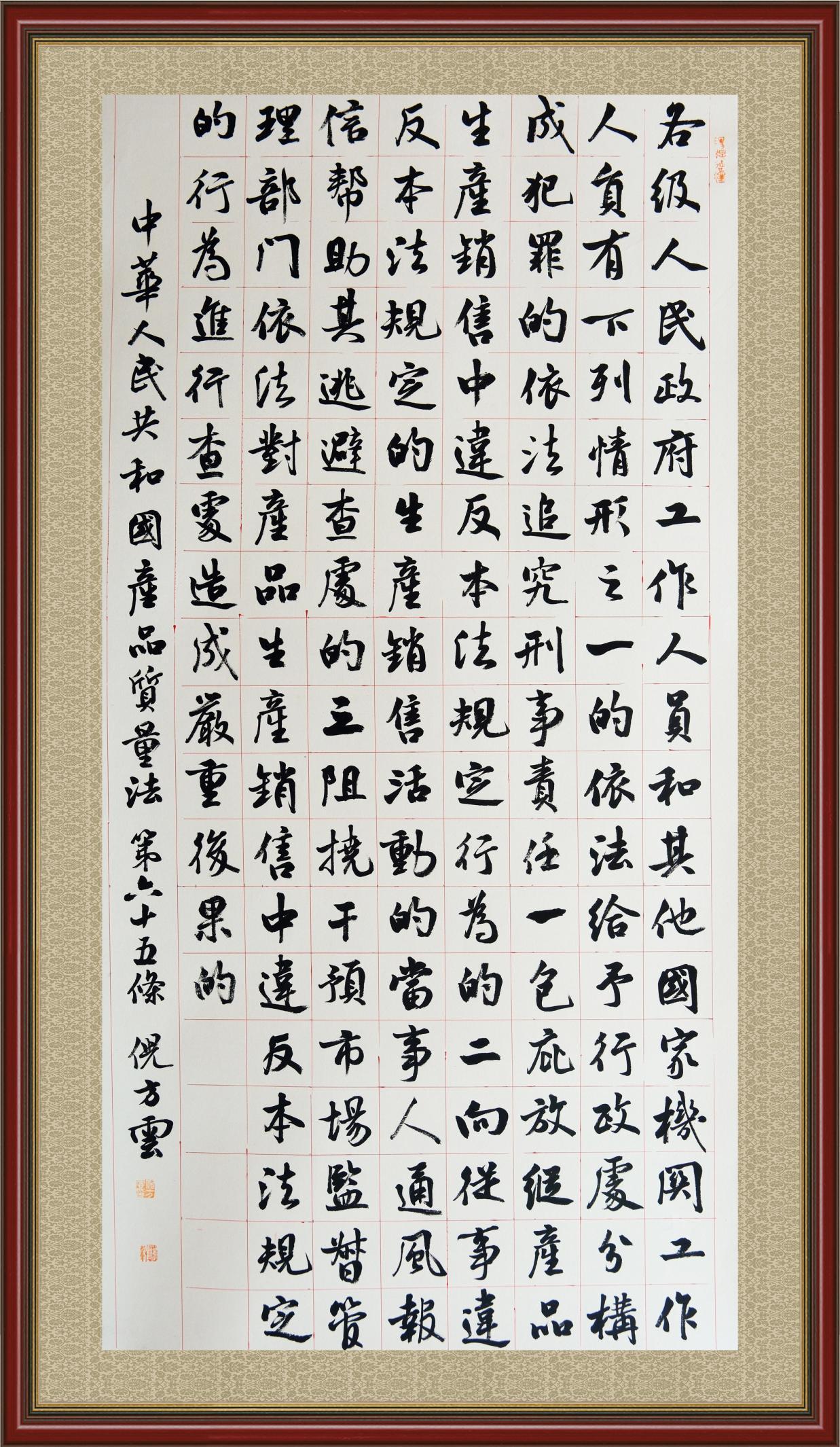 《中華人民共和國產品質量法》自1993年9月1日起開始施行,先后進行三次修正。作為產品質量領域的基本法律,產品質量法對規(guī)范產品質量管理、維護消費者合法權益、促進經濟社會發(fā)展具有重要意義。為更好地學習、宣傳、貫徹這部法律,在國家市場監(jiān)督管理總局法規(guī)司的支持下,法治日報社開展了“‘書·法’系列活動之書寫《中華人民共和國產品質量法》”活動。