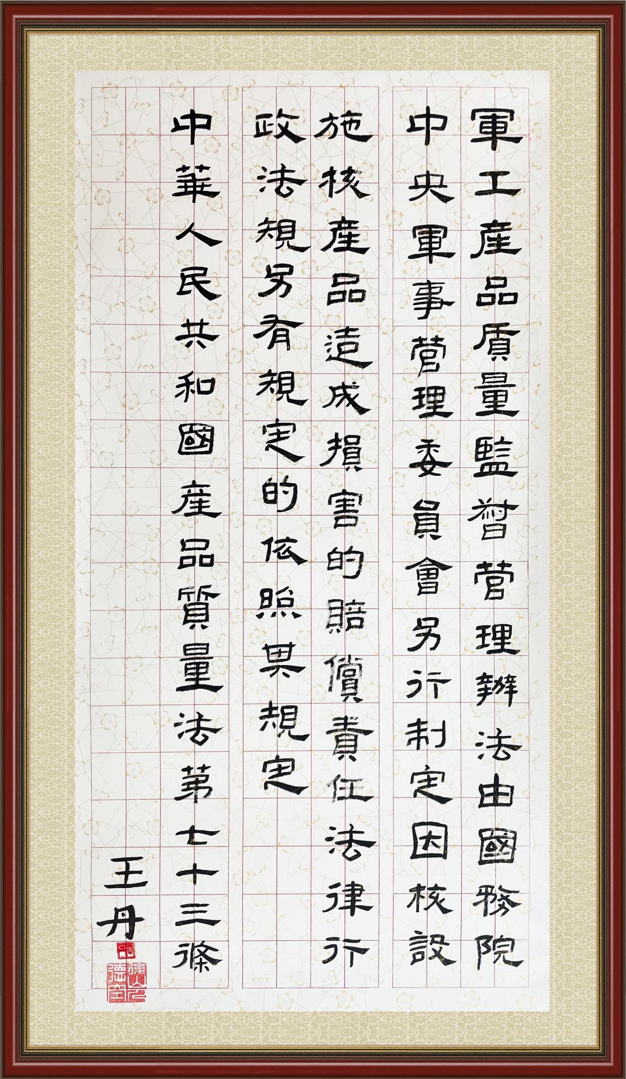 《中華人民共和國產(chǎn)品質(zhì)量法》自1993年9月1日起開始施行,先后進(jìn)行三次修正。作為產(chǎn)品質(zhì)量領(lǐng)域的基本法律,產(chǎn)品質(zhì)量法對規(guī)范產(chǎn)品質(zhì)量管理、維護(hù)消費(fèi)者合法權(quán)益、促進(jìn)經(jīng)濟(jì)社會(huì)發(fā)展具有重要意義。為更好地學(xué)習(xí)、宣傳、貫徹這部法律,在國家市場監(jiān)督管理總局法規(guī)司的支持下,法治日報(bào)社開展了“‘書·法’系列活動(dòng)之書寫《中華人民共和國產(chǎn)品質(zhì)量法》”活動(dòng)。