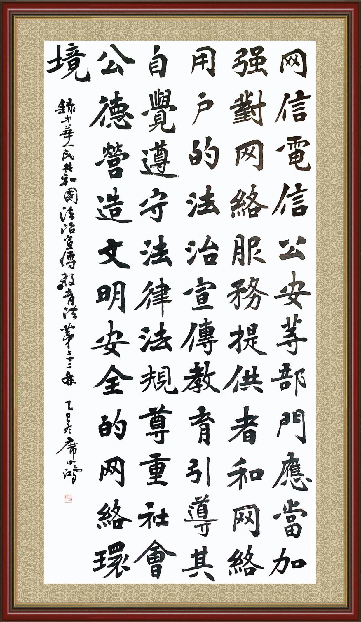 2020年7月11日,由法治日報社主辦的“書·法”系列活動正式啟動,先后書寫《中華人民共和國民法典》《中華人民共和國憲法》《中華人民共和國民營經(jīng)濟促進(jìn)法》等21部法律法規(guī)。