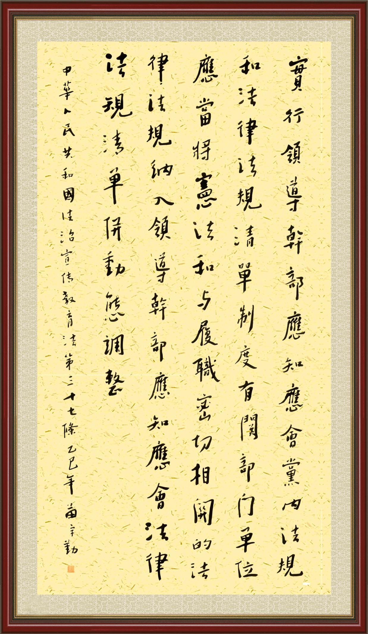 2020年7月11日,由法治日報社主辦的“書·法”系列活動正式啟動,先后書寫《中華人民共和國民法典》《中華人民共和國憲法》《中華人民共和國民營經濟促進法》等21部法律法規(guī)。
