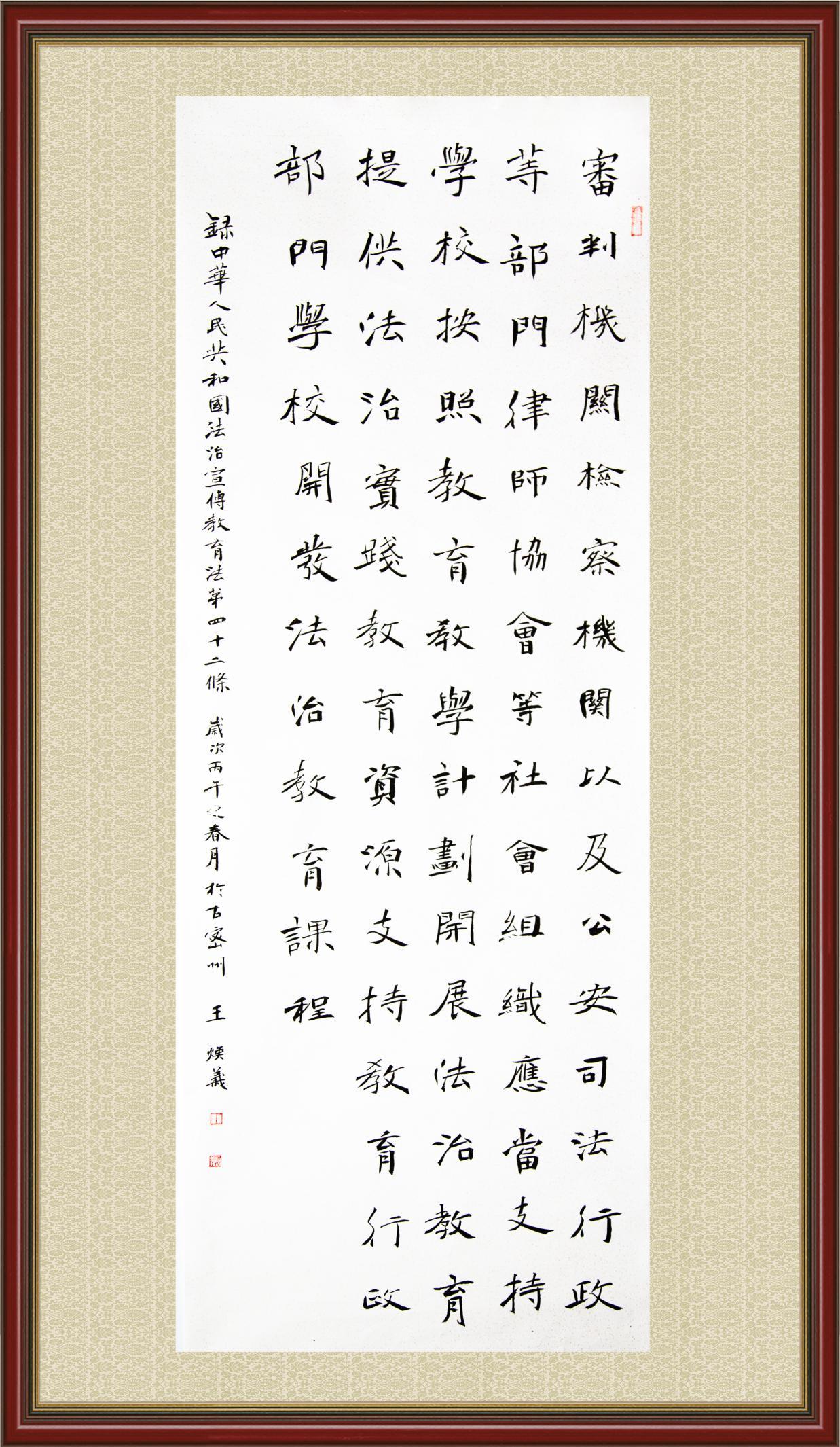2020年7月11日,由法治日?qǐng)?bào)社主辦的“書·法”系列活動(dòng)正式啟動(dòng),先后書寫《中華人民共和國(guó)民法典》《中華人民共和國(guó)憲法》《中華人民共和國(guó)民營(yíng)經(jīng)濟(jì)促進(jìn)法》等21部法律法規(guī)。