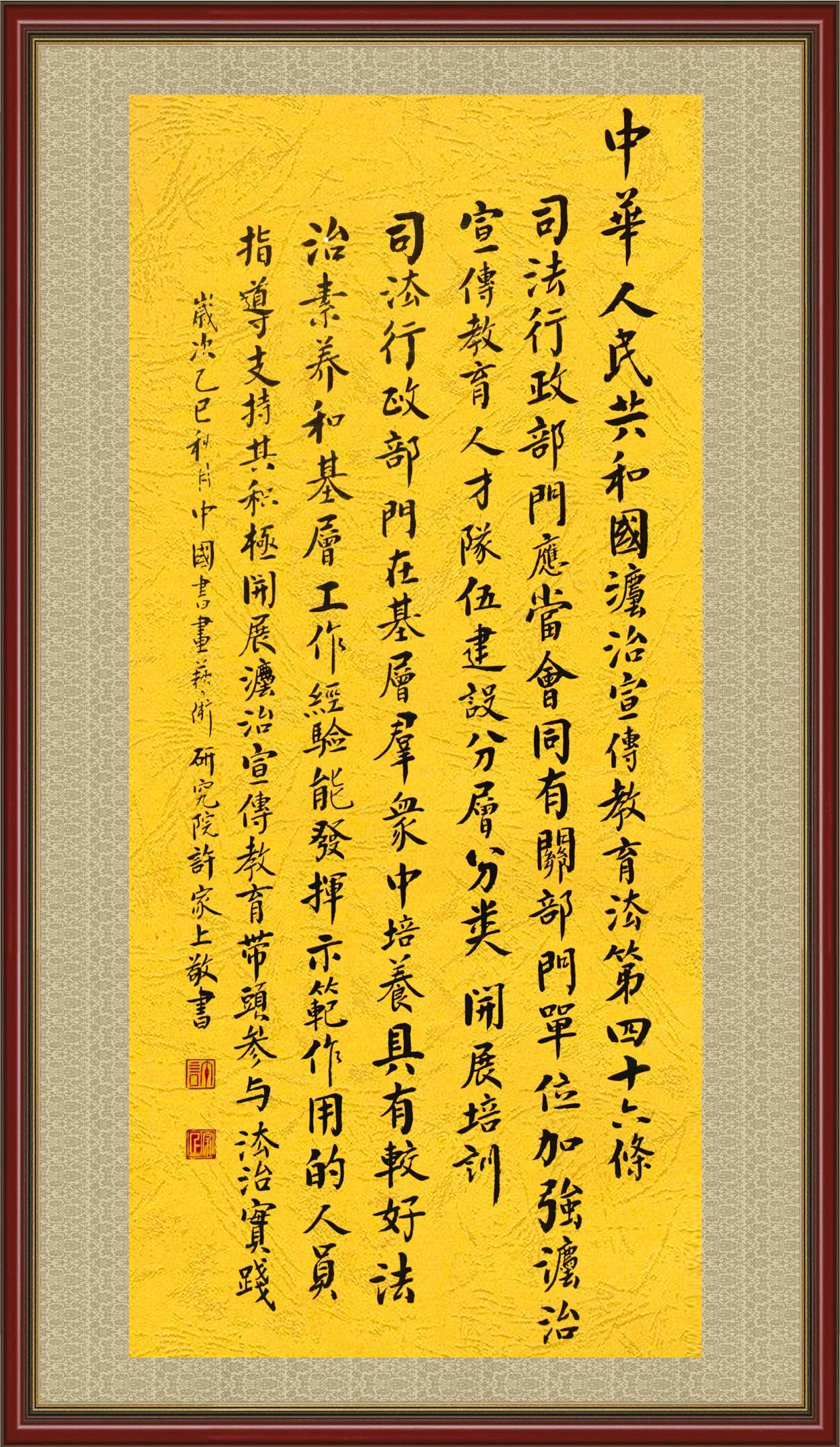 2020年7月11日,由法治日報社主辦的“書·法”系列活動正式啟動,先后書寫《中華人民共和國民法典》《中華人民共和國憲法》《中華人民共和國民營經(jīng)濟(jì)促進(jìn)法》等21部法律法規(guī)。