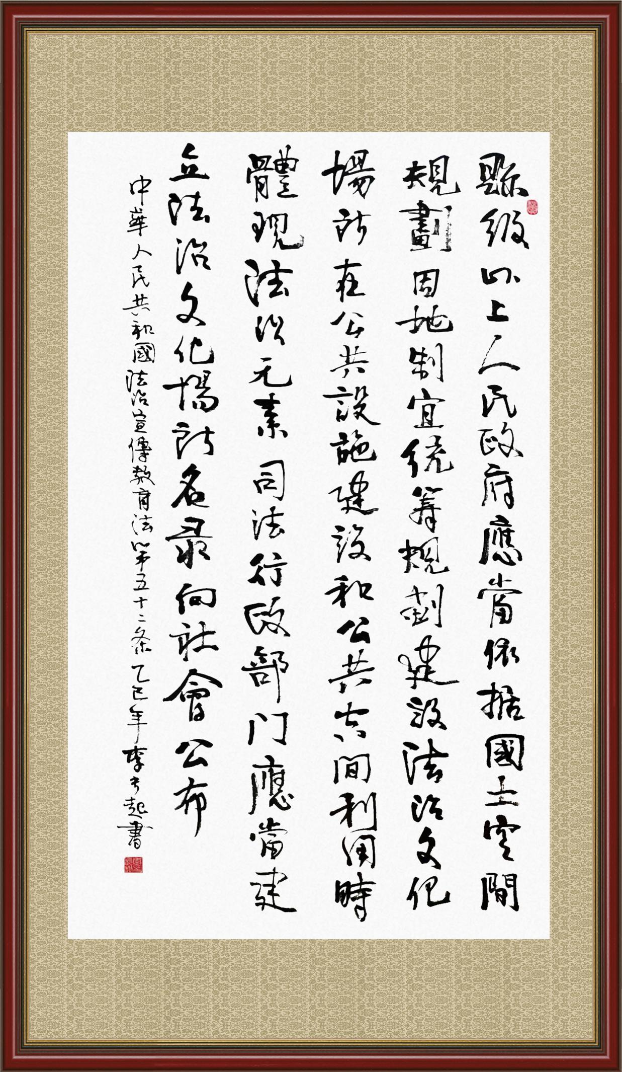2020年7月11日,由法治日報社主辦的“書·法”系列活動正式啟動,先后書寫《中華人民共和國民法典》《中華人民共和國憲法》《中華人民共和國民營經(jīng)濟促進法》等21部法律法規(guī)。